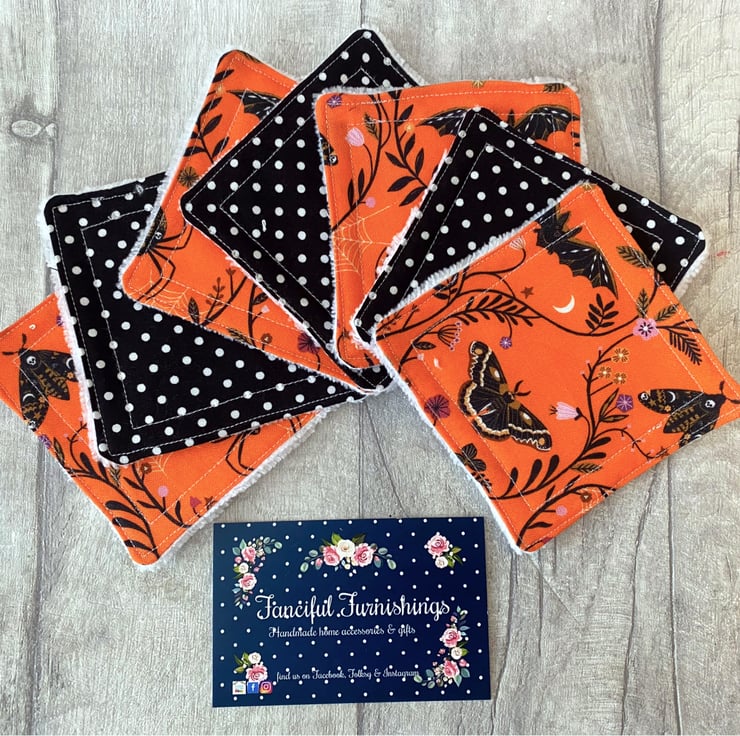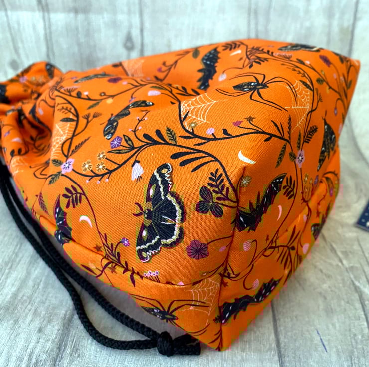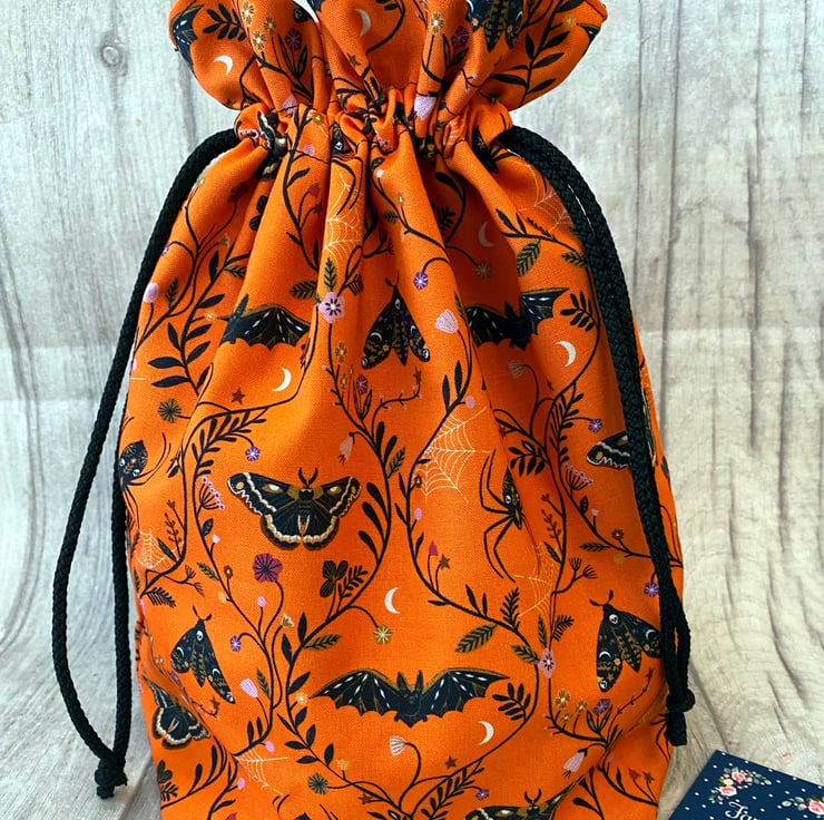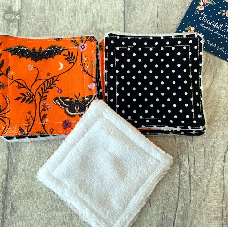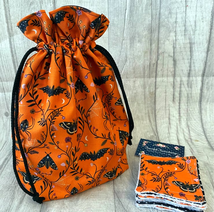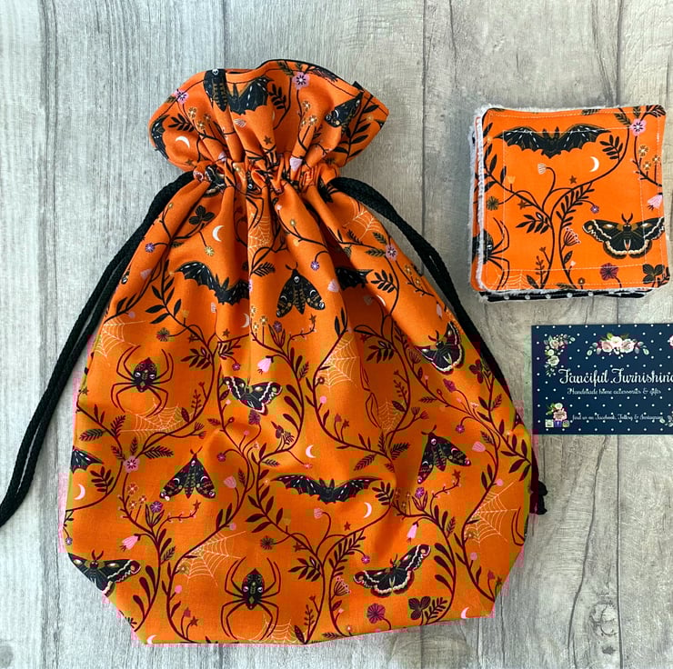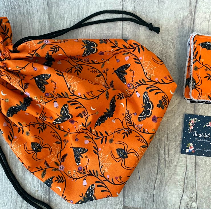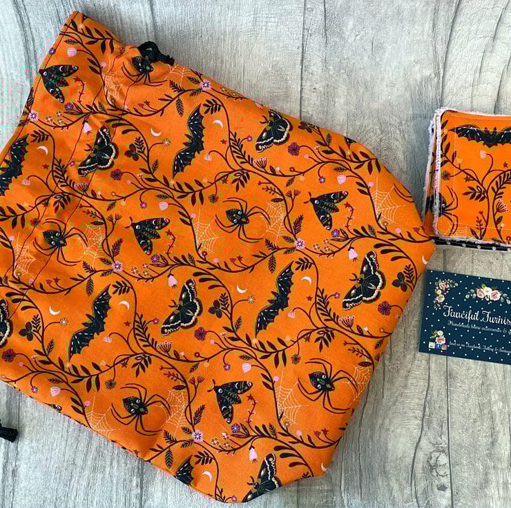 I’ve used a cotton fabric with fabulous bold orange fabric with bat, spiders & moth motifs. Ive matched it up with a bold black polka dot fabric on the wipes for a strong contrast. The wash bag is lined with black water resistant fabric.