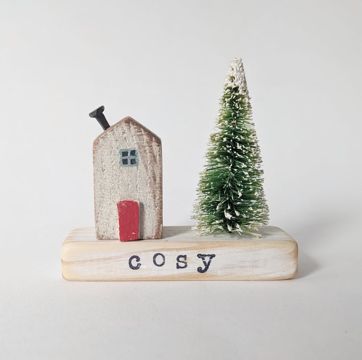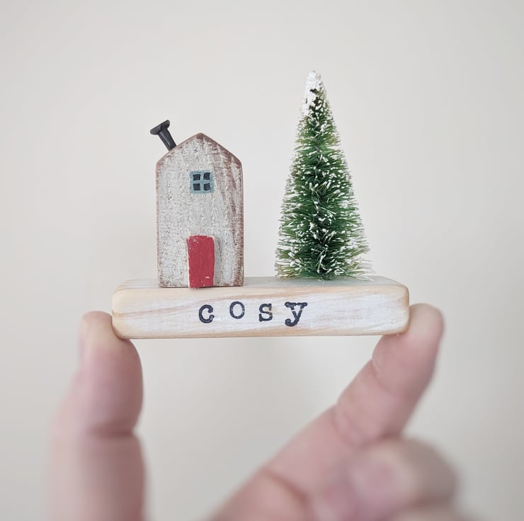 On a hand stamped wooden base, add your teeny painted house and tree.