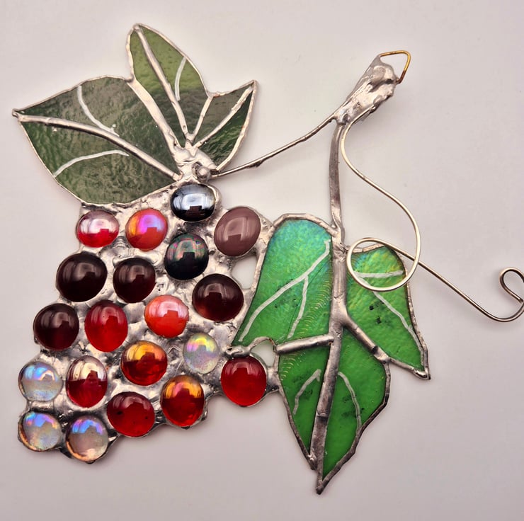 This 3D suncatcher is a grapevine with red, dark red, wine red, orange-red opalescent or transparent, clear iridescent glass pebbles, and hand-cut green opalescent glass leaf and a light green iridescent glass leaf, both with silver painted detail. Copper foiled and silver soldered together with silver wire twists. A hook is attached to the top to hang it where required. The finished piece measures approximately 20cm x 20cm x 3cm.