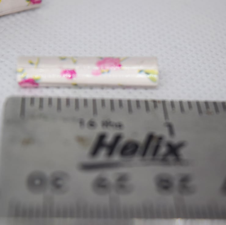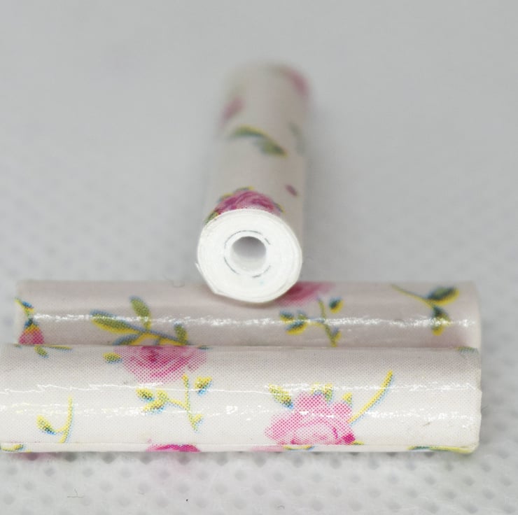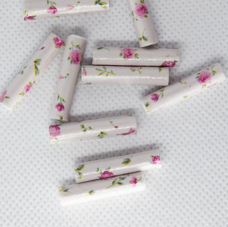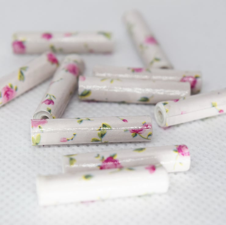 A set of 10 handmade paper beads with a pattern of small pink roses.