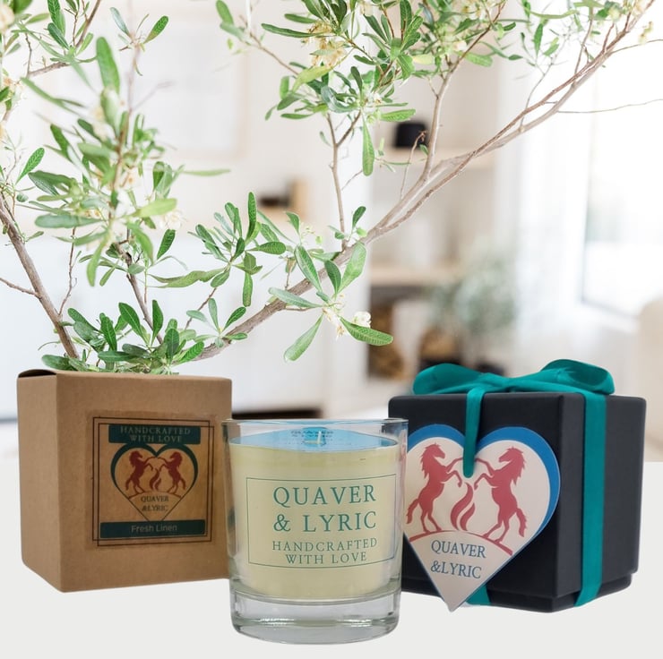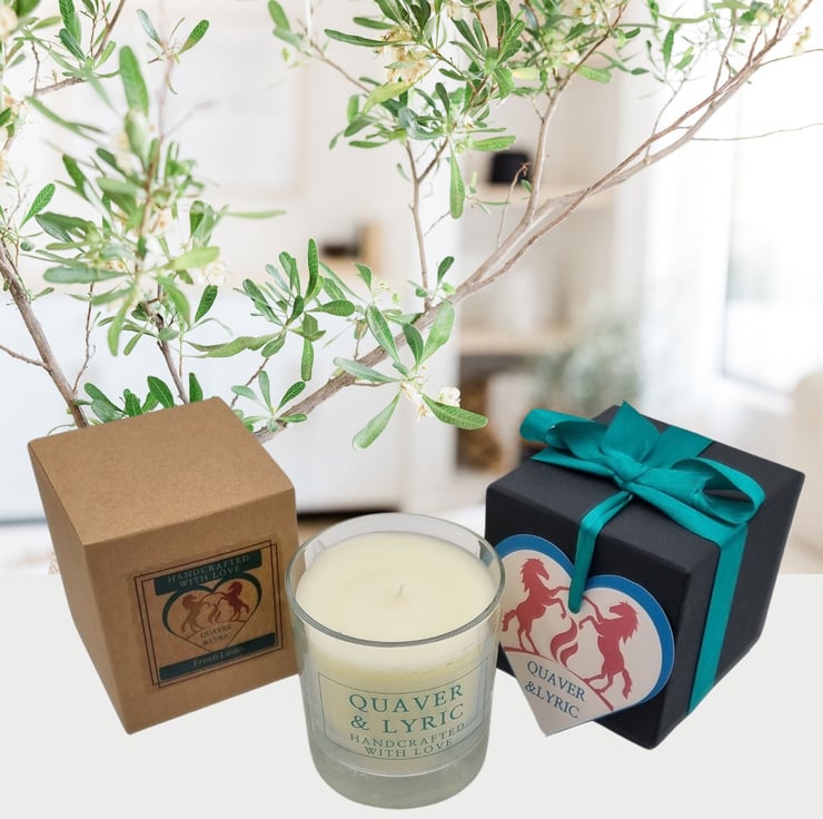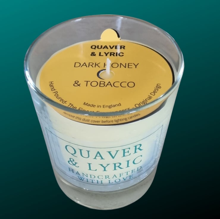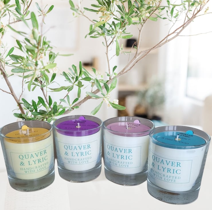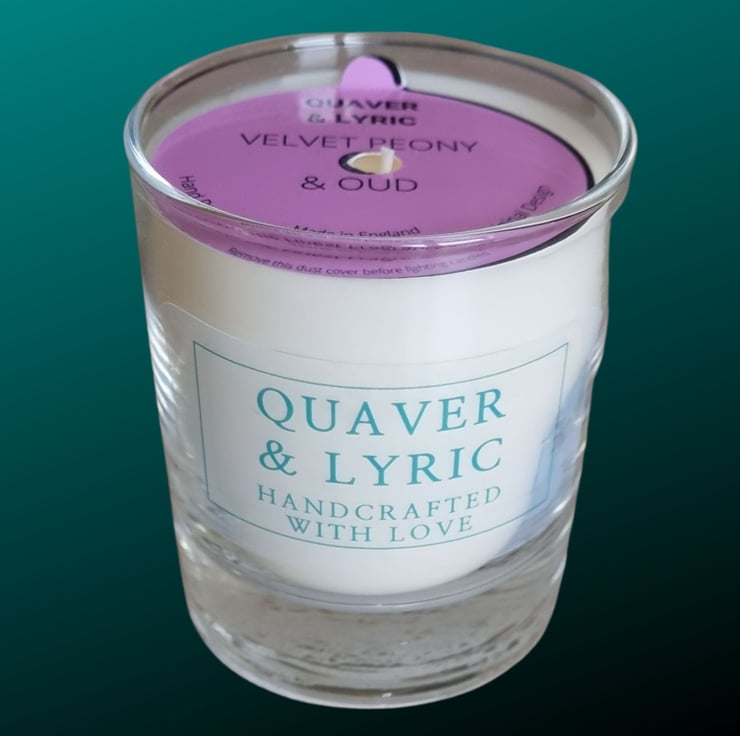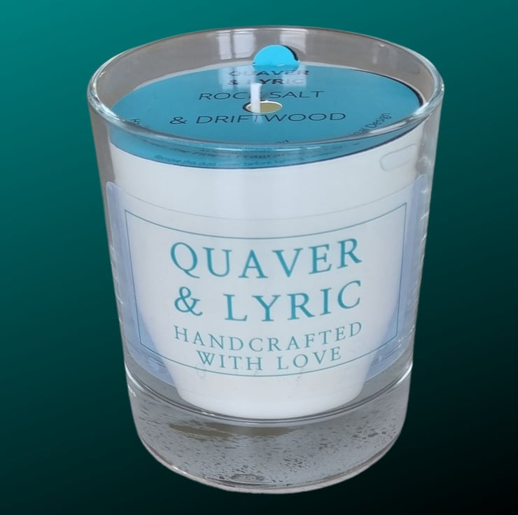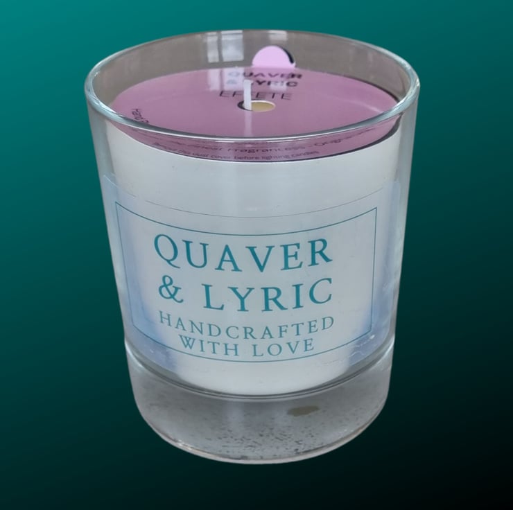 Scented candle with a plain Quaver and Lyric label on the glass container. Handmade in Northamptonshire using a quality rapeseed and mineral wax blend, the finest range of fragrances, hand-poured into quality glass containers and supplied in a kraft box. The design on the scented candle is made from permanent vinyl which can be cleaned (hand wash only) allowing the glass to be re-purposed as part of your home decor after the candle has burned.