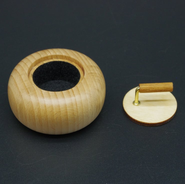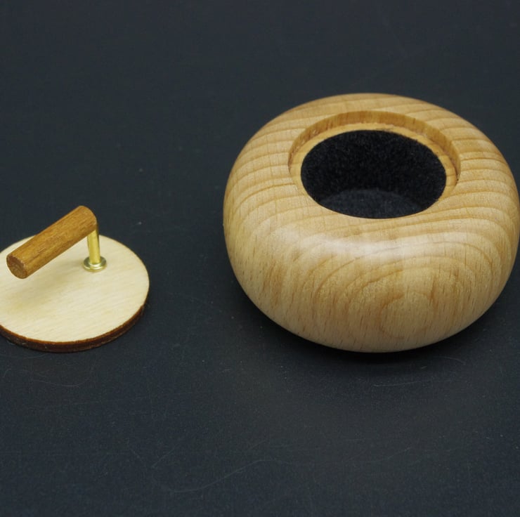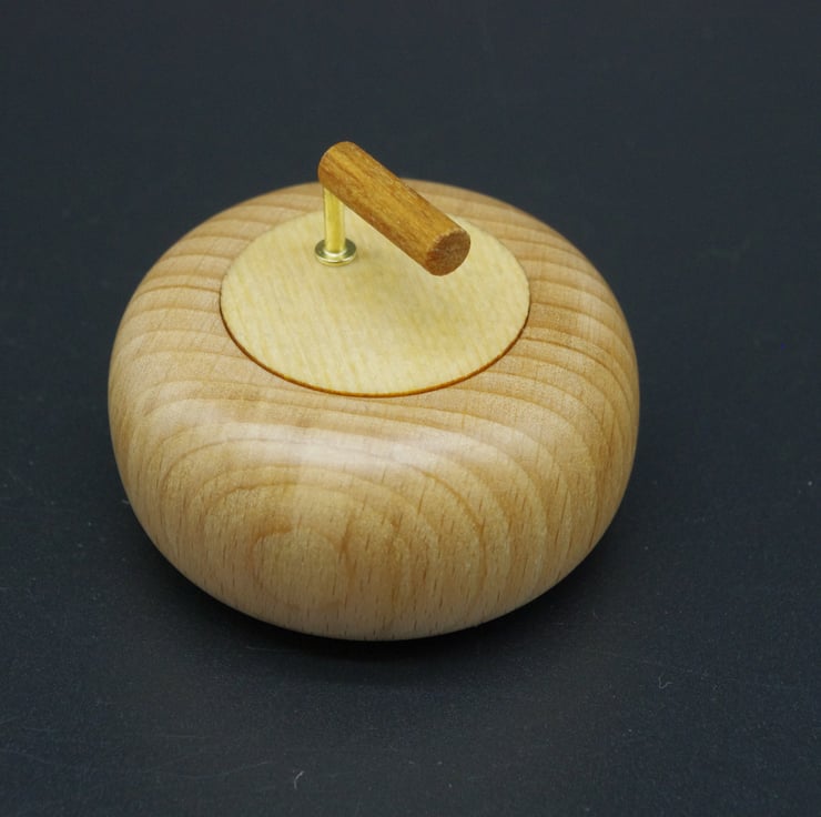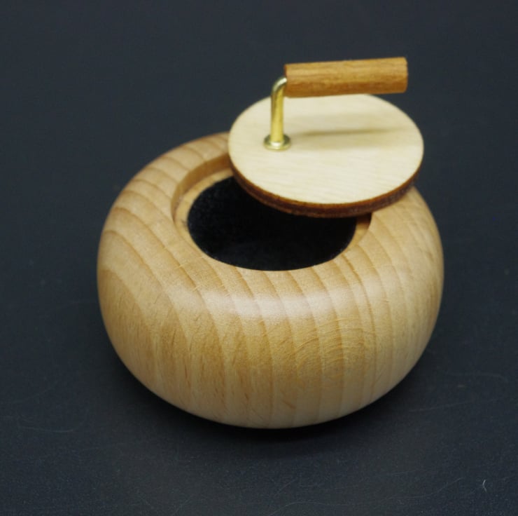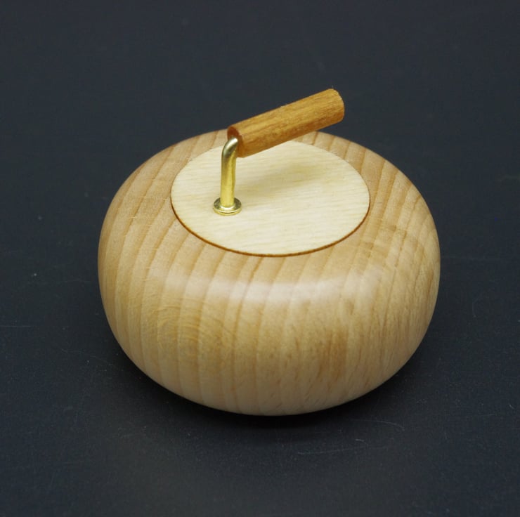 This delightful little ring box in the form of a miniature curling stone, is made from Beech with a Birch wood lid.
