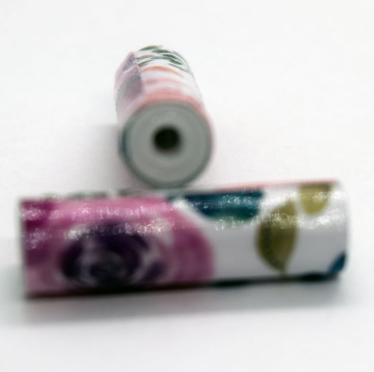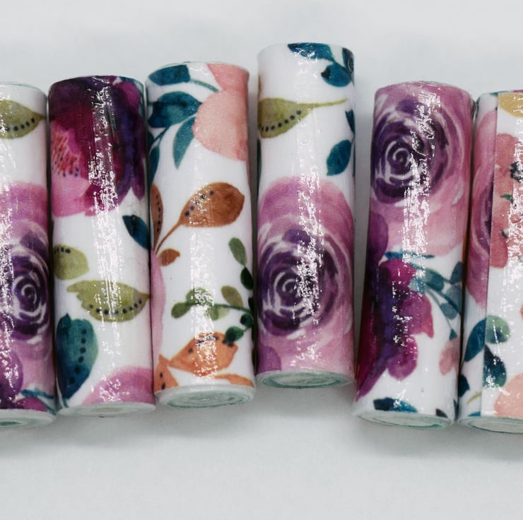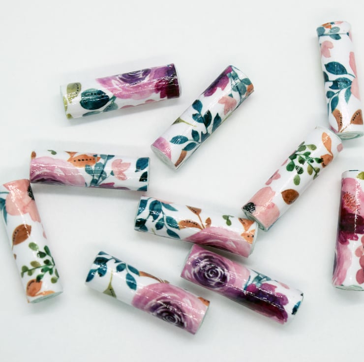 A set of 10 handmade paper beads with a pattern of pink and purple roses.