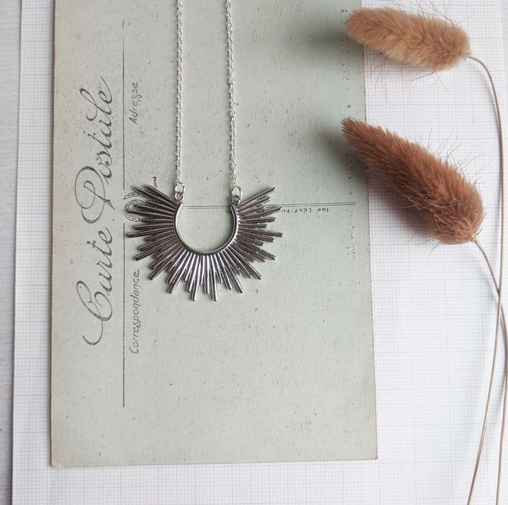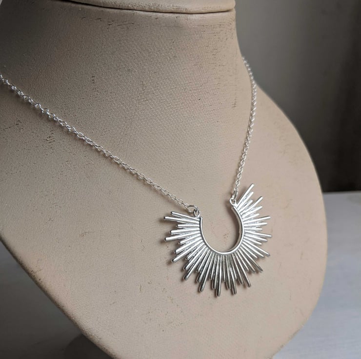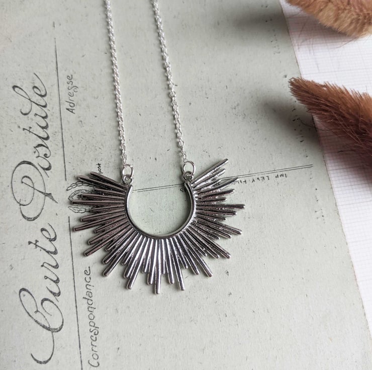 The pendant measures 1" 3/4 wide, and 1" 1/4 tall. The chain is silver plated. Necklace measures 18" long in total. Nickel free.