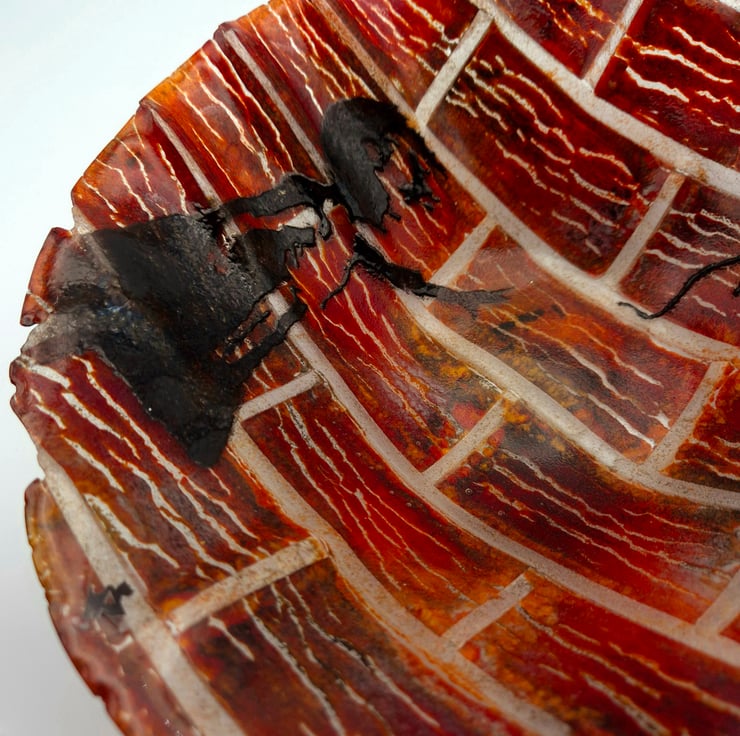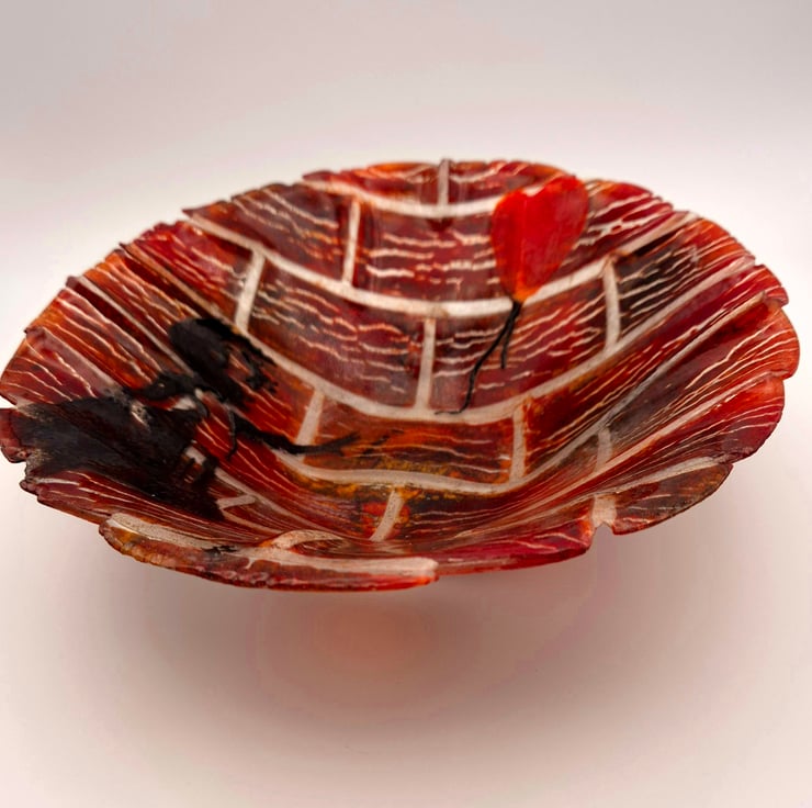 This unique fused glass bowl was handmade by using coloured glass powders on clear glass. This represents a well-known Banksy image of "Girl with Balloon" on a brick wall. It has a brick texture on the reverse. The piece is 23cm in diameter and 8cm deep. I made this as part of my work for my BA(Hon) at the University of Sunderland based at the National Glass Centre.
