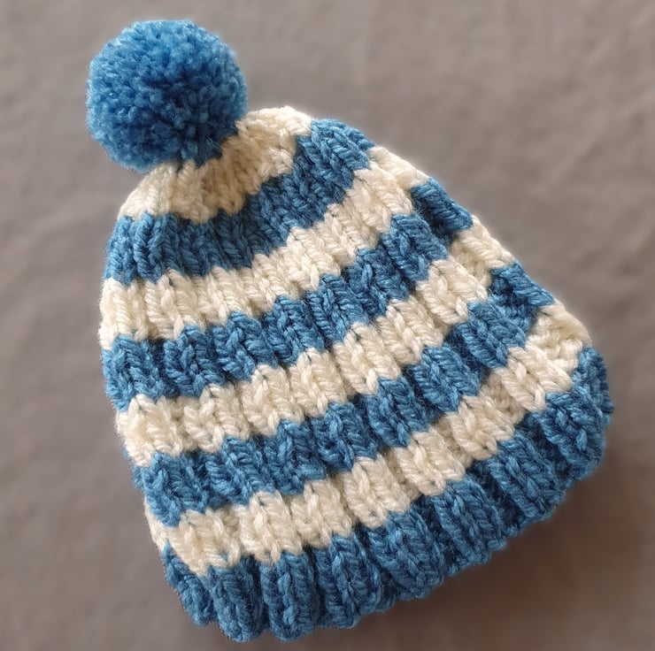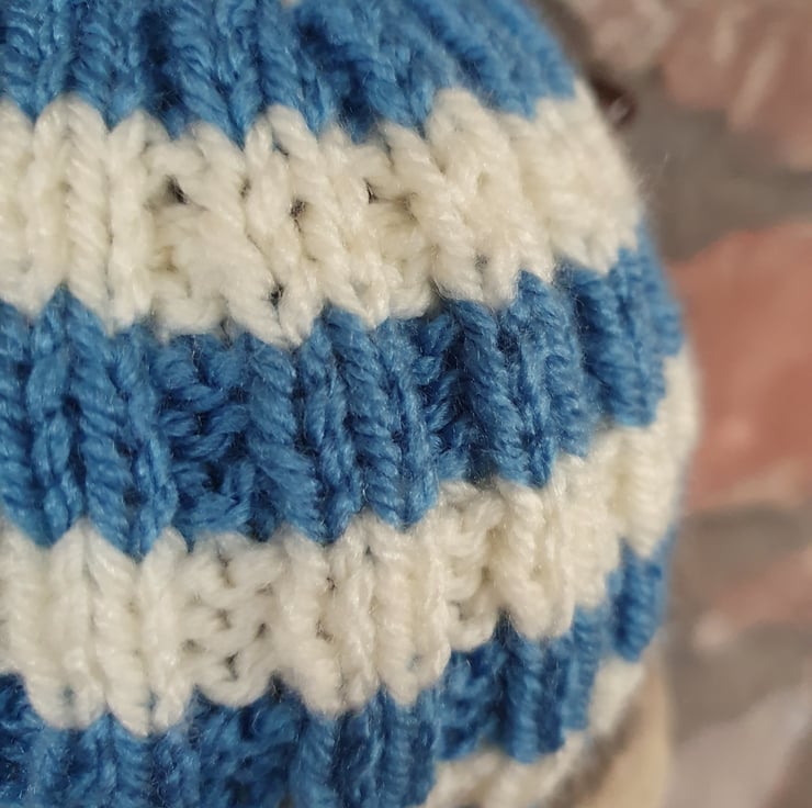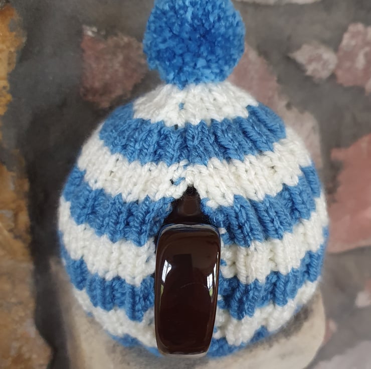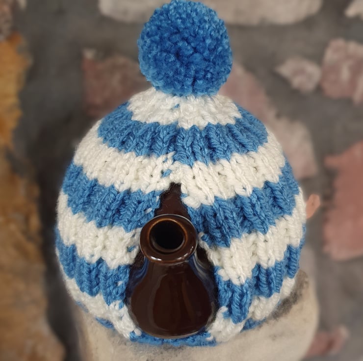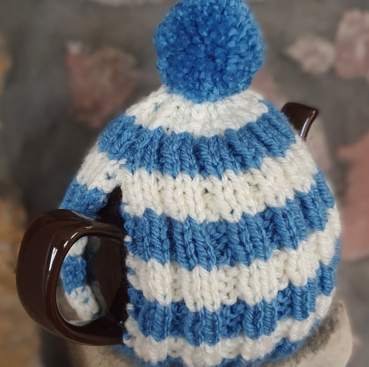 Vegan Friendly Small Cornish Striped Tea Cosy for 2 Cup Tea Pot, Blue and Cream/Ecru, Hand Knitted