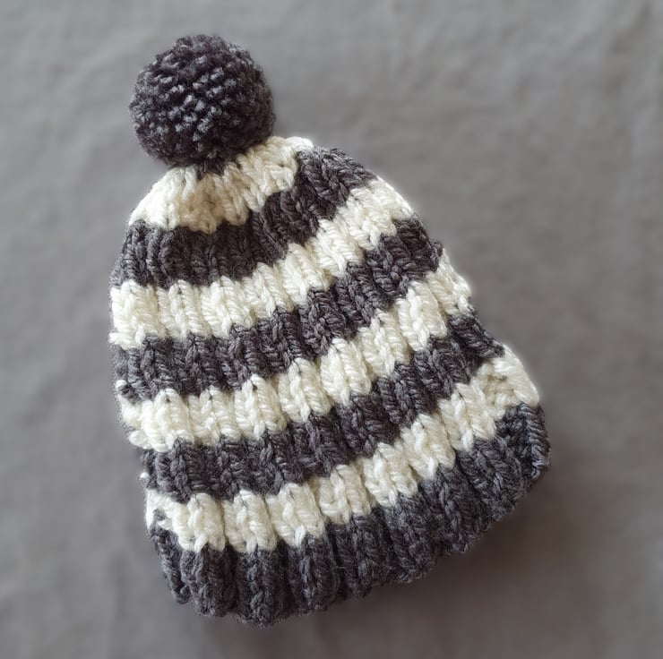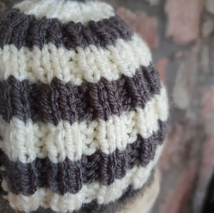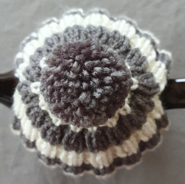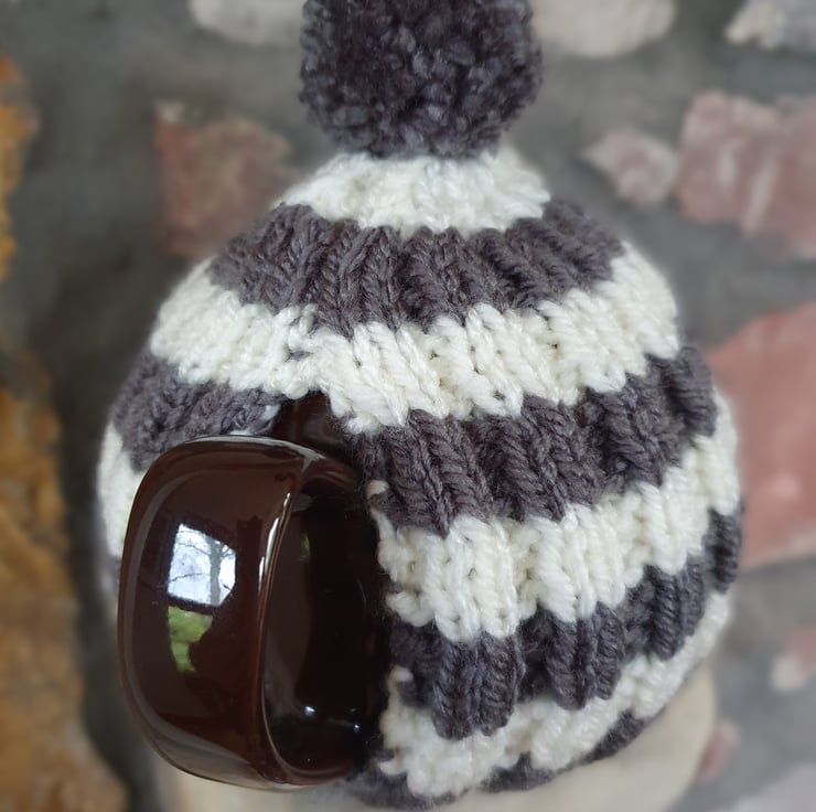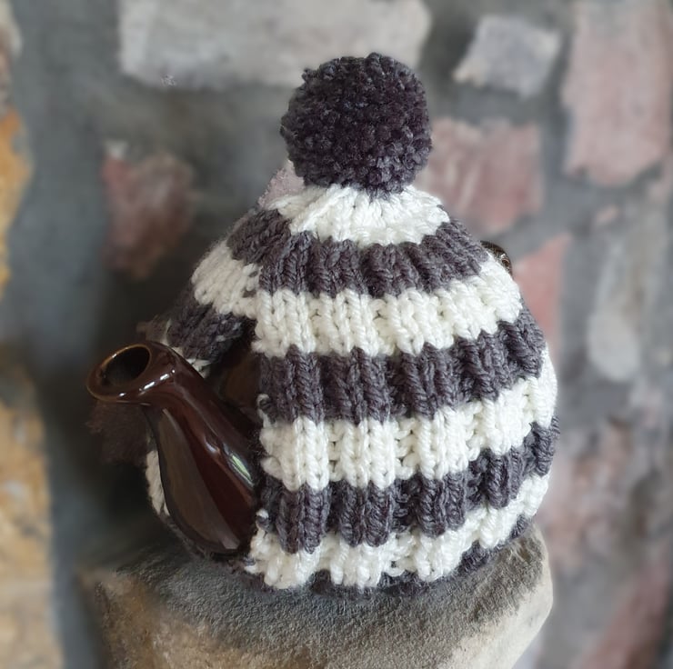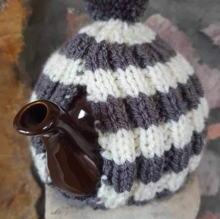 Vegan Small Cornish Striped Tea Cosy for 2 Cup Tea Pot, Grey and Cream/Ecru, Hand Knitted