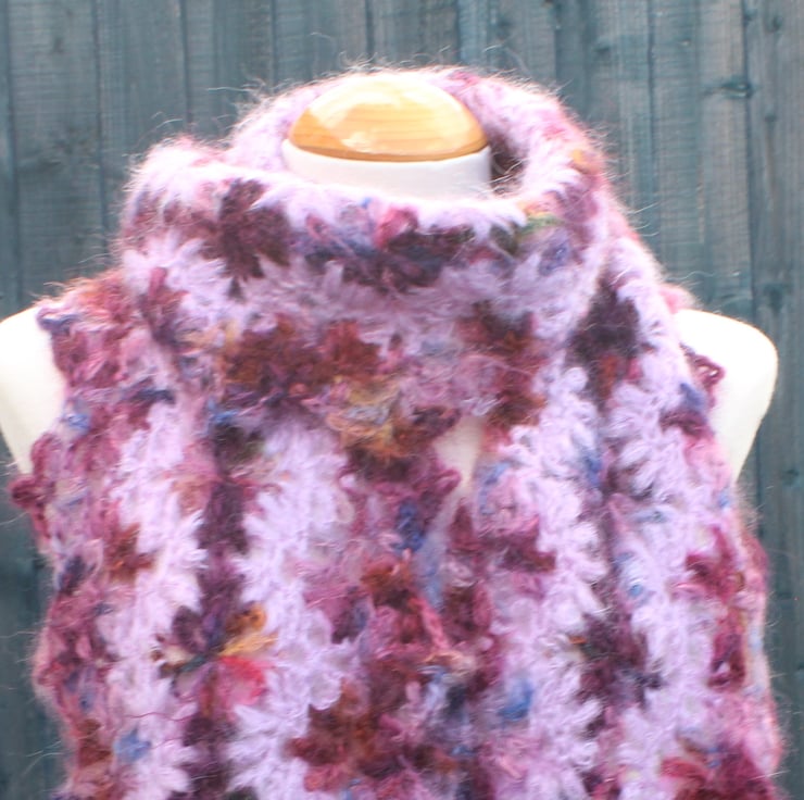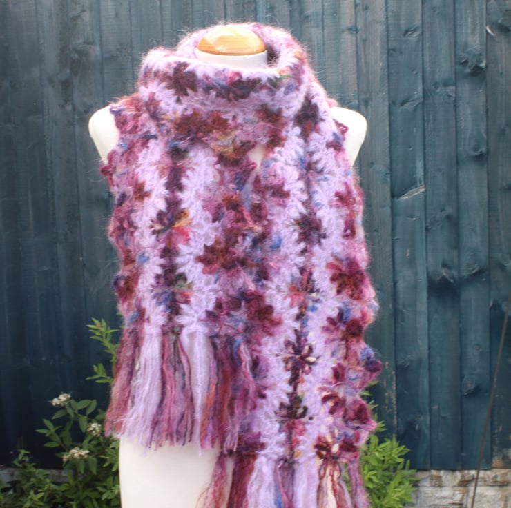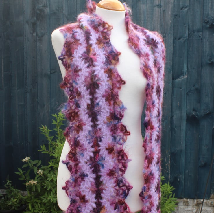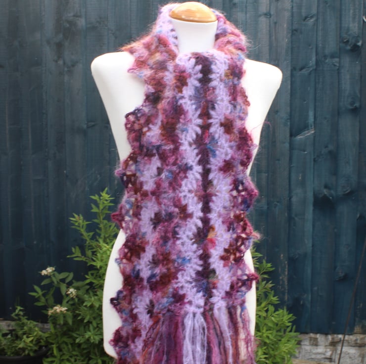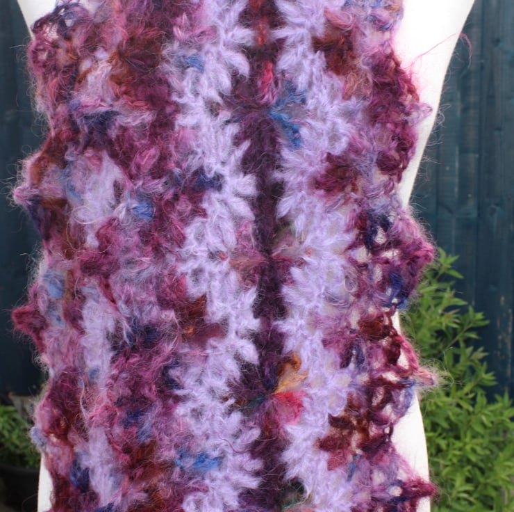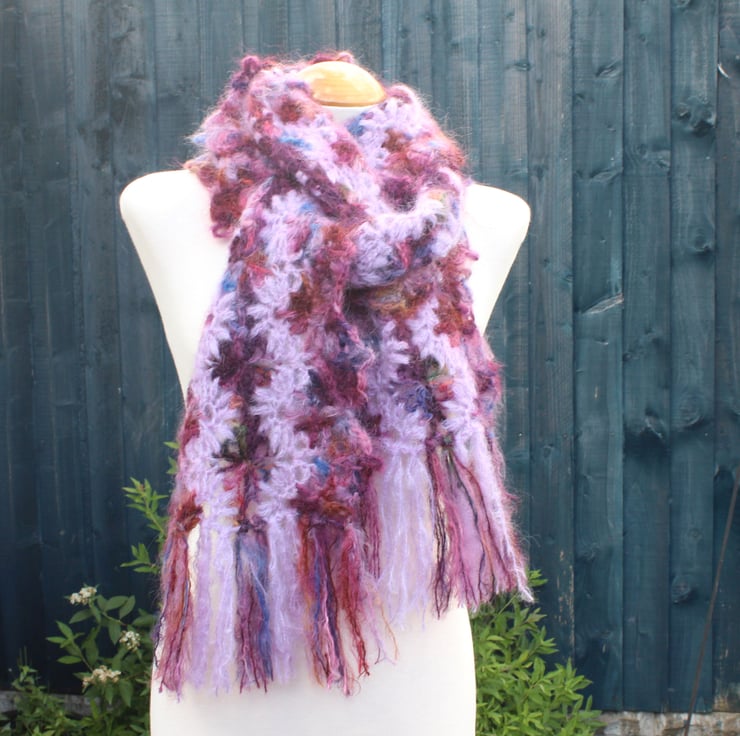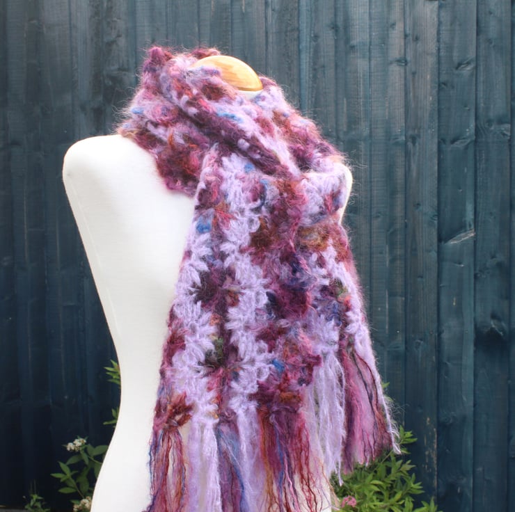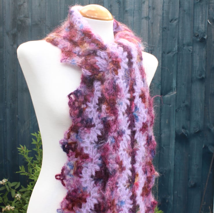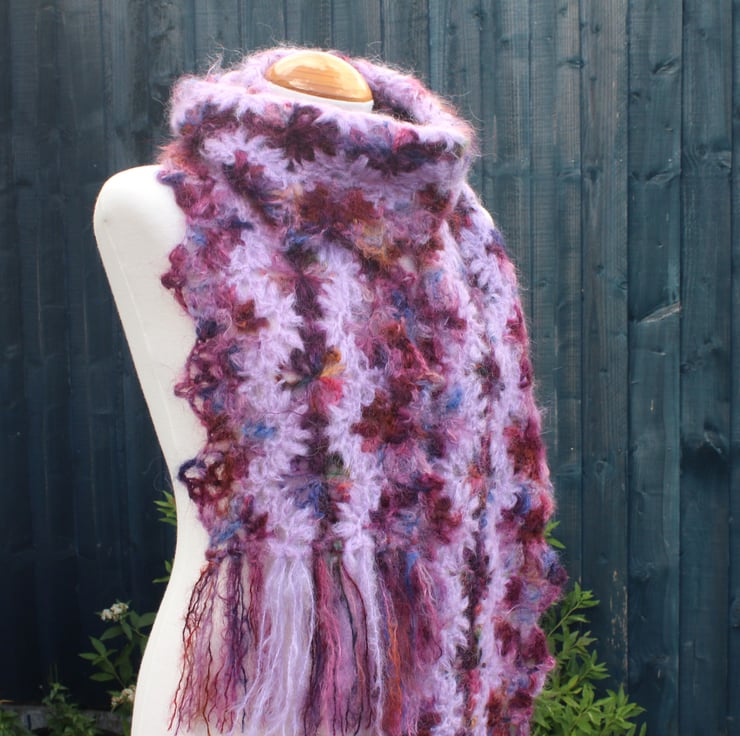 This long scarf has been crocheted by me using a vintage commercial yarn in purple-multi Mohair together with some vintage Mohair in lilac. Due to the generous length this can be tied or styled in a variety of ways.