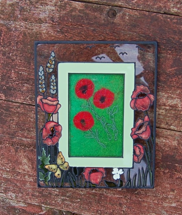 A pretty framed picture of Poppies, Needle felted onto hand dyed felt and embellished with hand embroidered petals and stems.