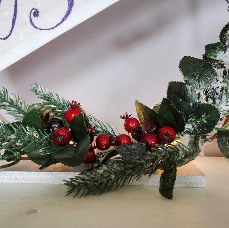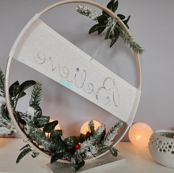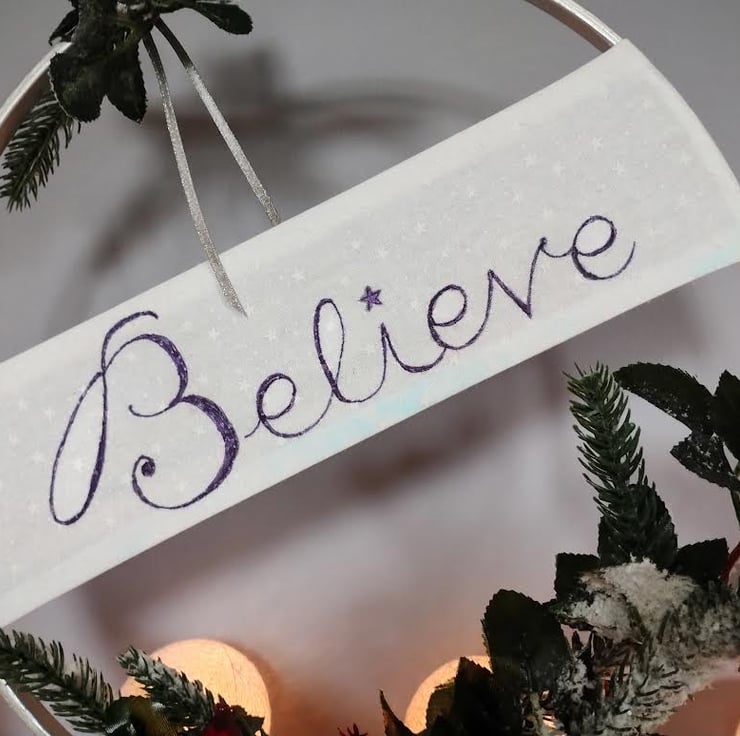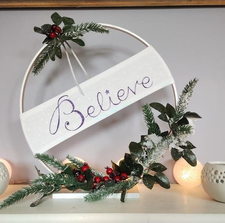 A beautiful, unique 'Believe' decoration with the word written onto cotton fabric. Attached to a wooden hoop that sits on a stand, making it easy to put in the perfect place in your home. The artificial snow-covered foliage has been attached to both the bottom and top of the hoop, giving it a real festive feel. A decoration that can be used year after year. A beautiful gift. Ready to be posted.