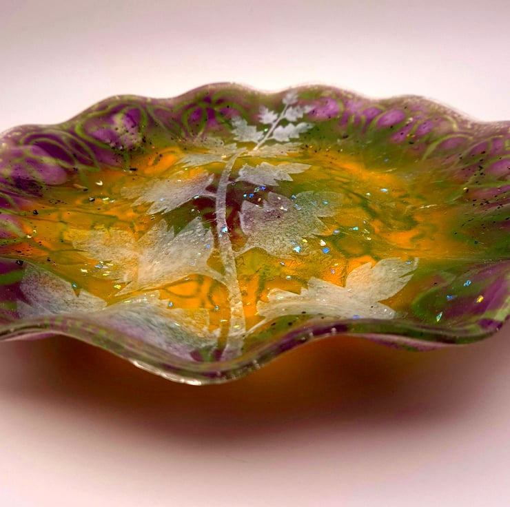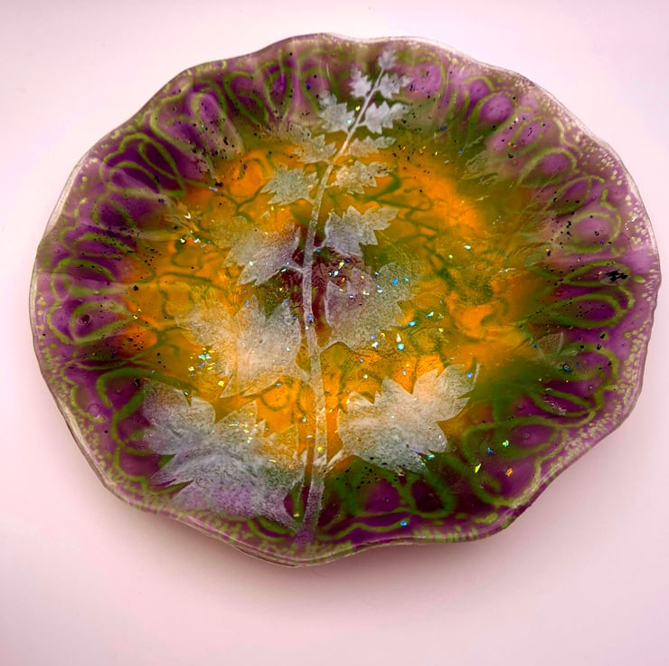 This piece was made from glass powders to create a textured disc fused onto a transparent glass circle. After the first firing, a hand-cut template of fern leaves was used to add more glass powders and a sprinkling of dichroic glass frit was also added. These were then tack-fused to the circle; before the final firing, give the piece its shape. It measures 28cm in diameter by 3cm and has a textured reverse. Small stoppers have been added to the back so as not to catch any surface it is put on.