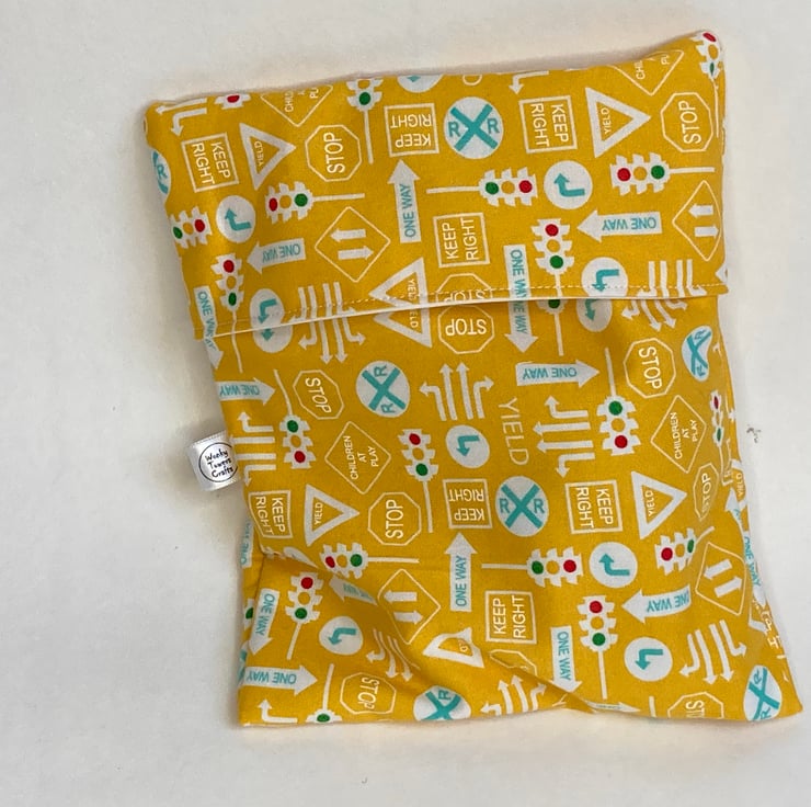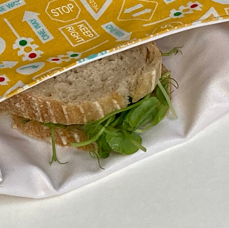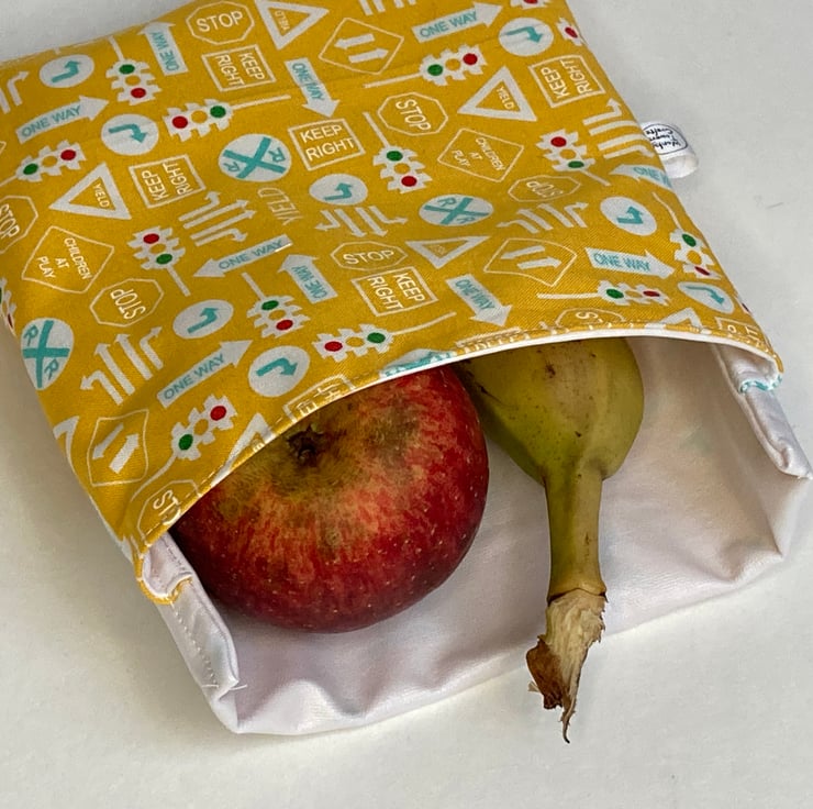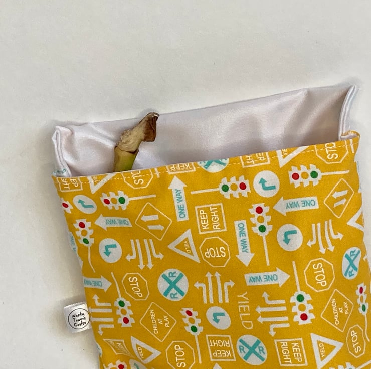 The outside is made from yellow cotton fabric decorated with road signs. The lining is a white food-safe, waterproof fabric known as PUL - more details below. It is great to keep food fresh, can be wiped clean or washed by hand or in the machine. Reduce your use of cling film, foil or single use plastics whilst making your lunch so much more attractive.