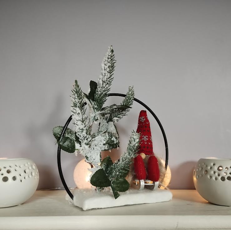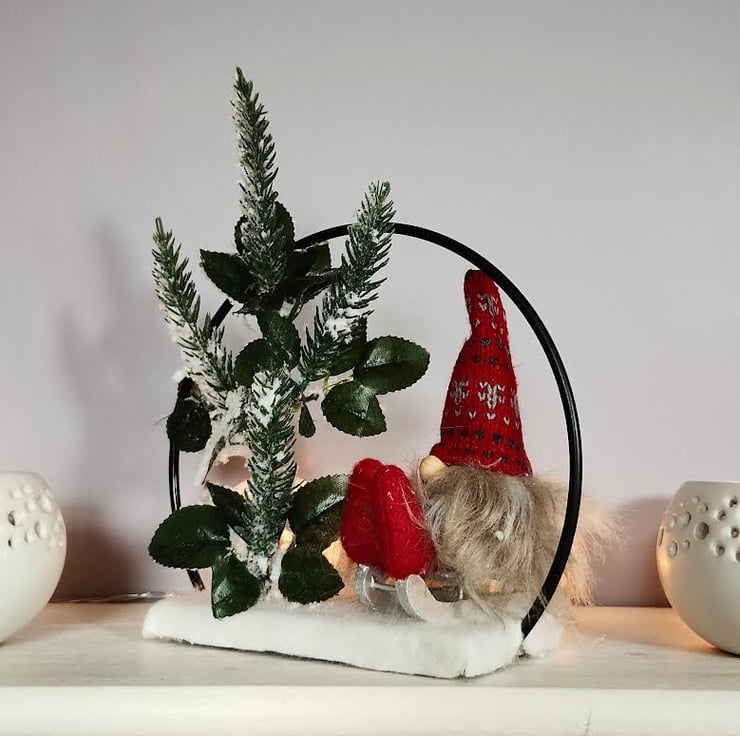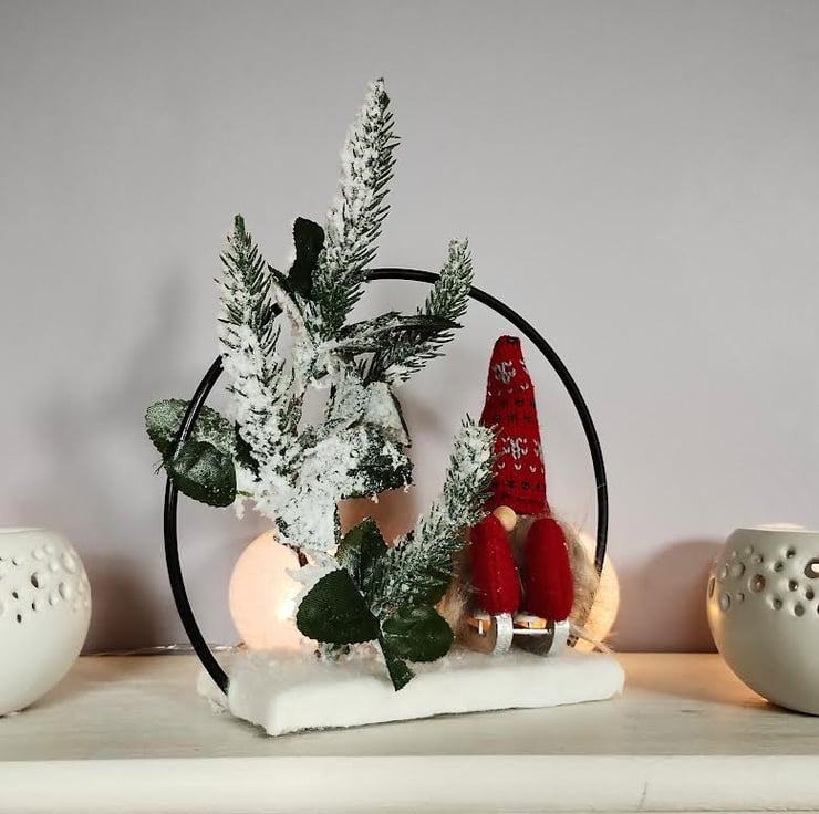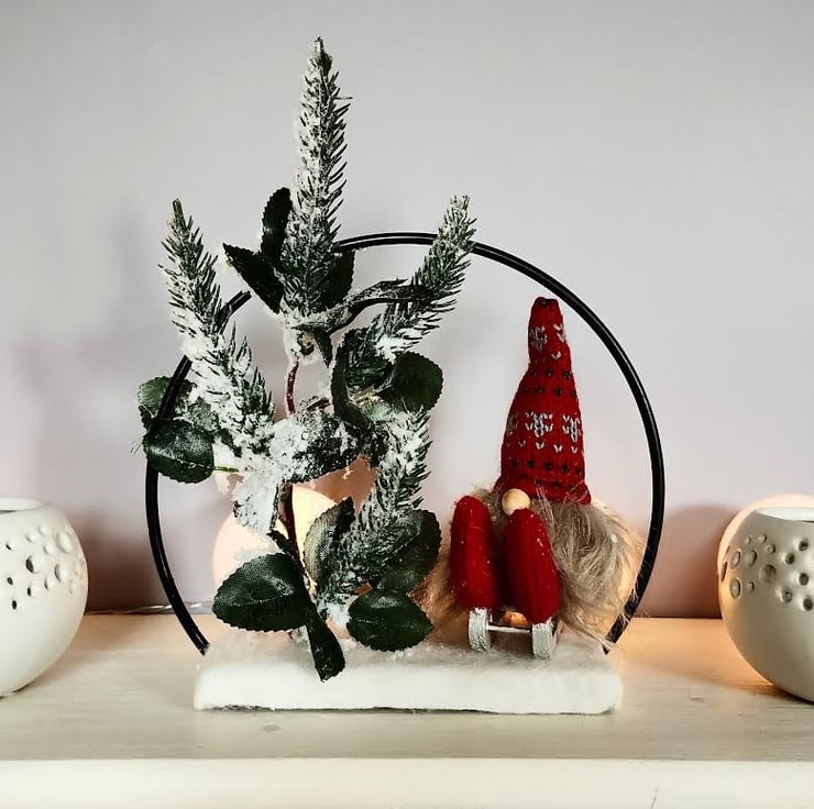 When I saw this cute gnome I just had to buy him and make a gnome themed Christmas decoration. The hoop I've had for ages and as it was the right size for such a little guy and hey presto here he is. A super addition to your Christmas décor and one that you can use year after year.