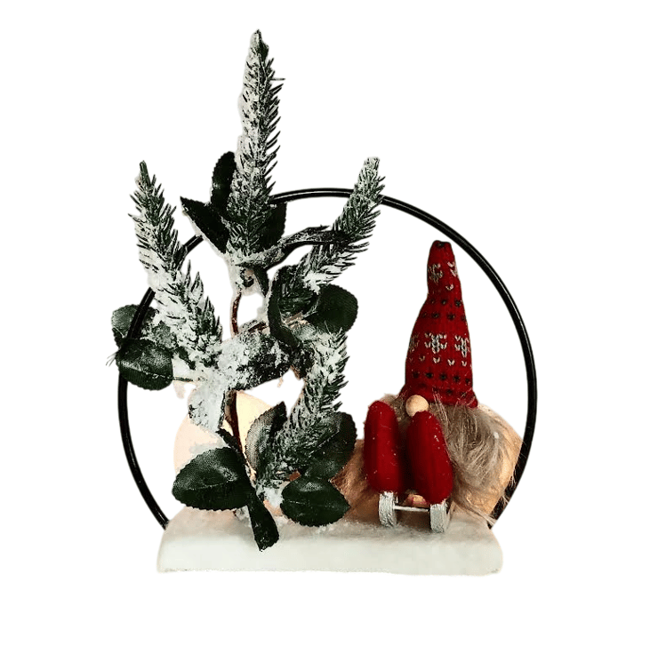 This cute gnome sits on his silver sleigh and is all ready to slide down the hill. He's made with a combination of wood with his festive outfit of wool mix is keeping him nice and cozy and his boots are Christmas red felt. Sitting on a hoop beside some artificial foliage giving a real festive look. His fabulous whiskers makes him very handsome indeed. A lovely Christmas ornament to add to your festive collection and can be put on display year after year. Lovely Christmas Gift. Ready to be posted now.
