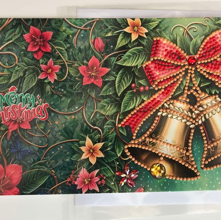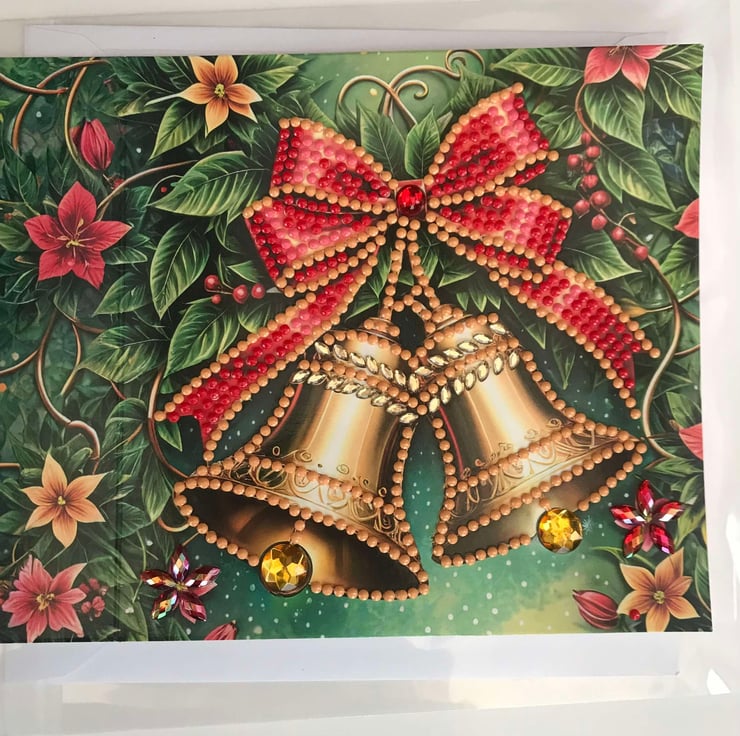“Gems” were manually placed one by one to create this amazing Christmas card-Bells Decoration . Worked for up to an hour on this card, 7 colours.