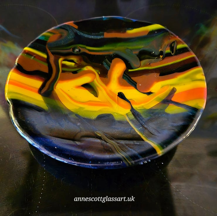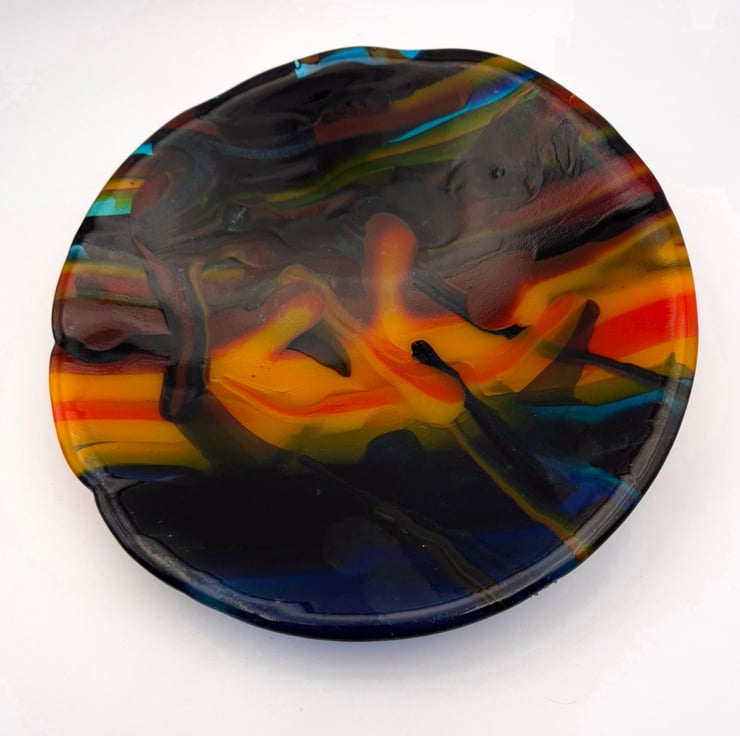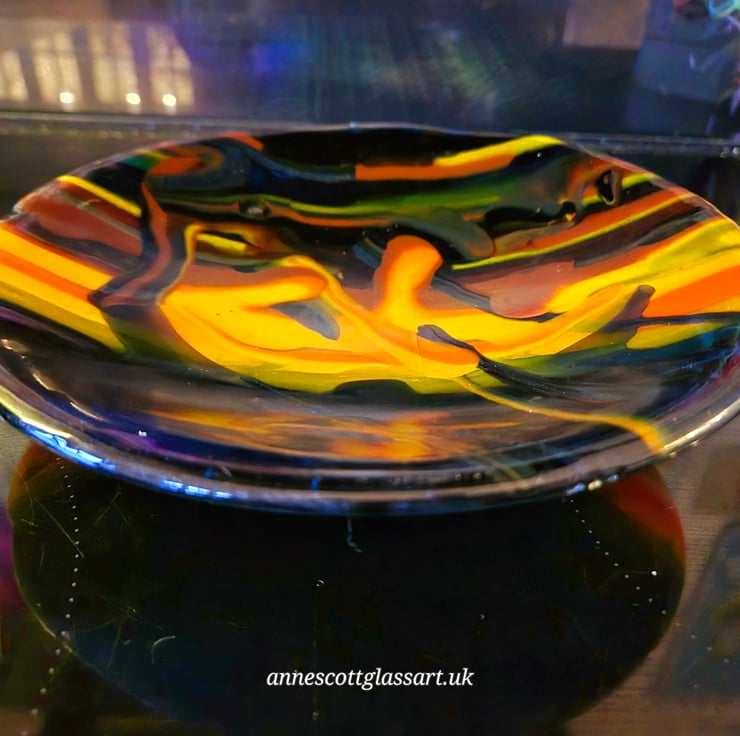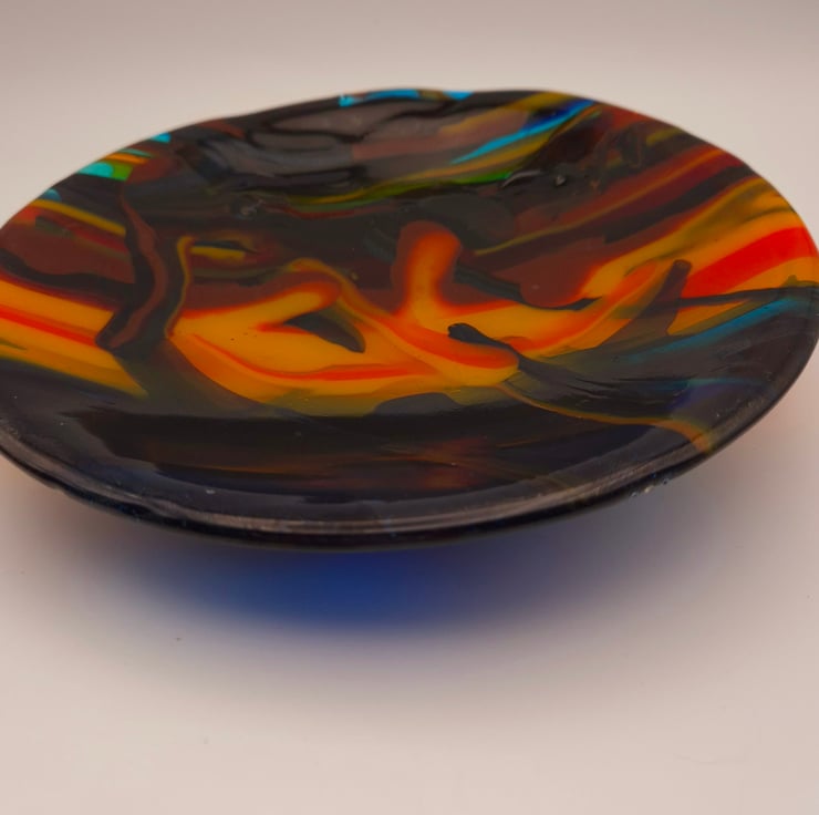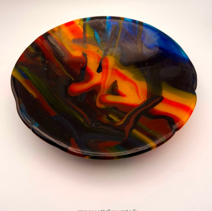 This bowl is 9mm thick and was made by fusing lots of my odds and ends of different coloured, transparent and opalescent glass and letting them mix. I then slumped into the bowl shape and left the uneven rim. It measures 21cm in diameter and 3cm tall.