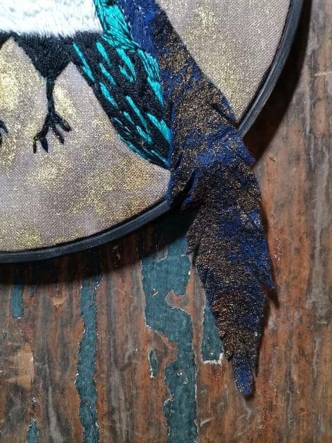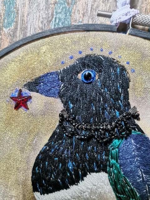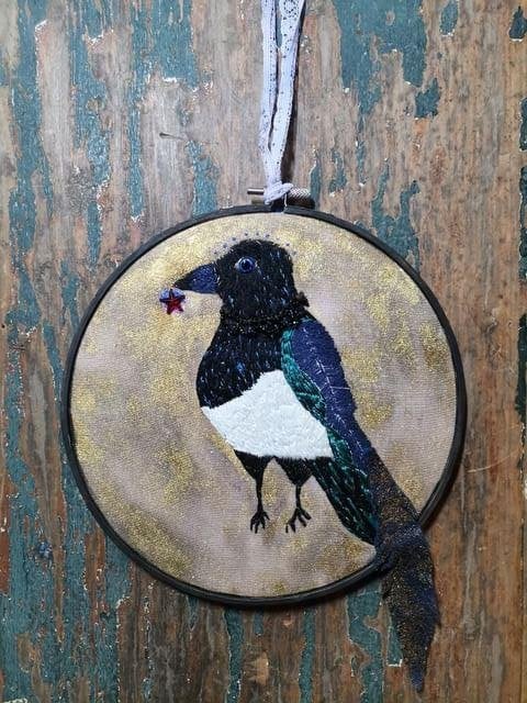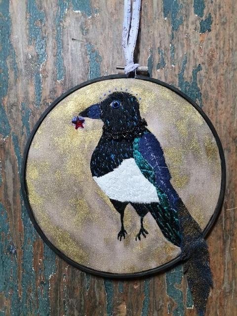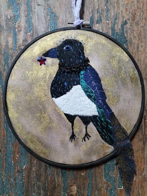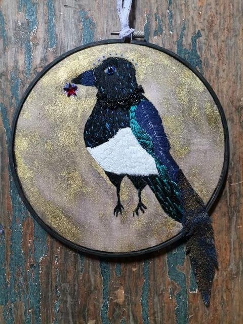 A hand embroidered magpie based on my own drawing, set in an embroidery hoop.