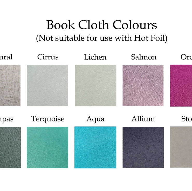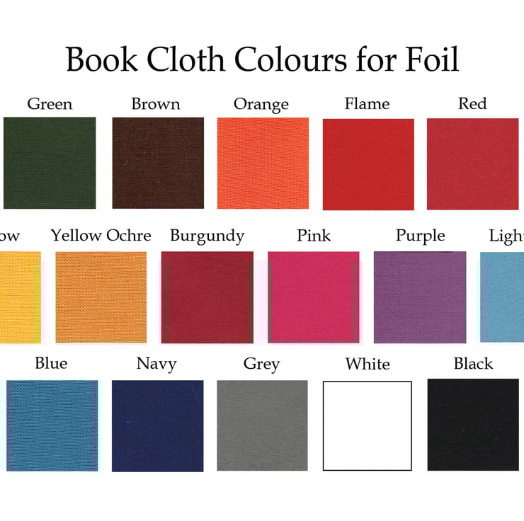 If you are wanting to use hot foil Heat transfer vinyl on your book, please choose a colour represented on the "Book Cloth Colours for Foil" sheet.
