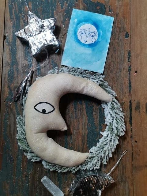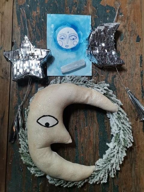 Including a textile art moon wreath with a vintage style textile moon, measuring approx 8 inches high