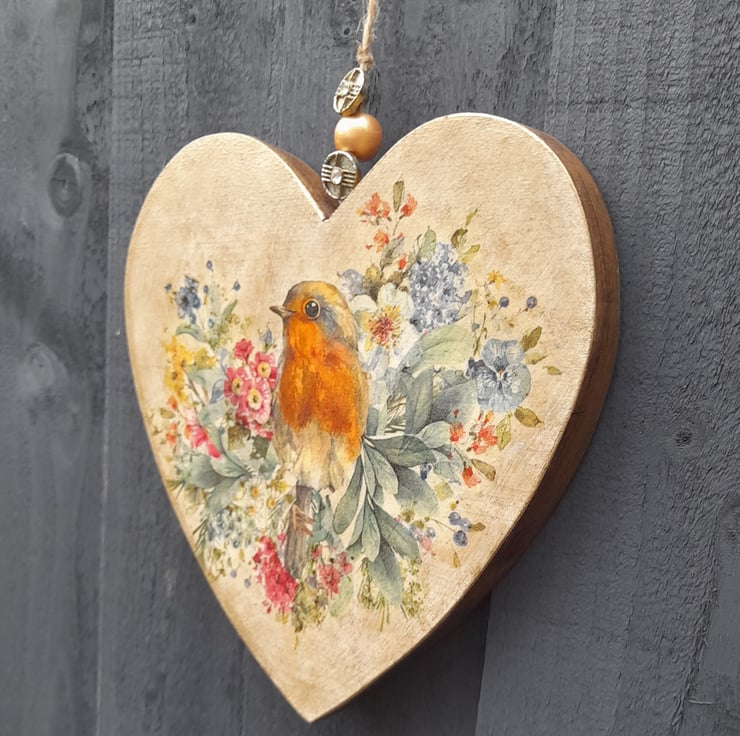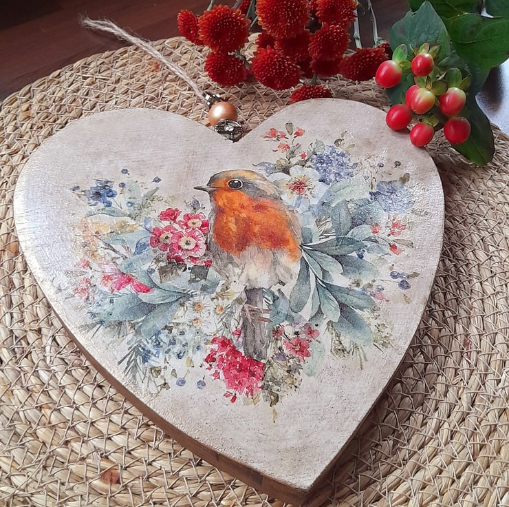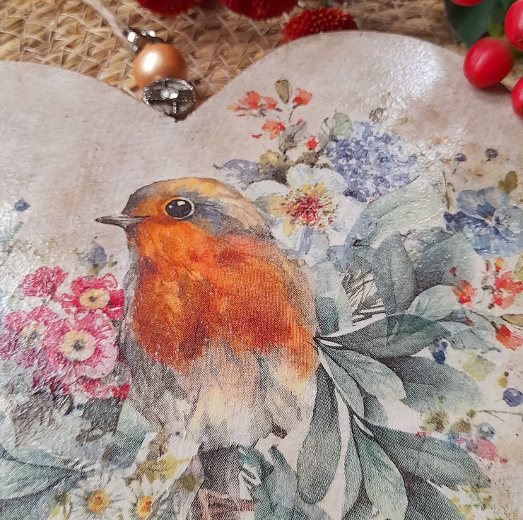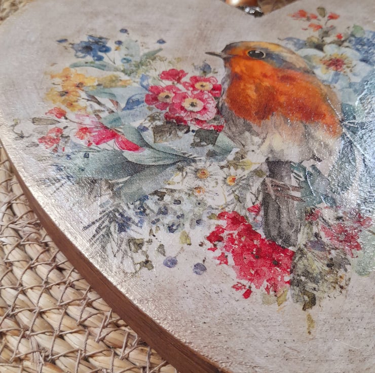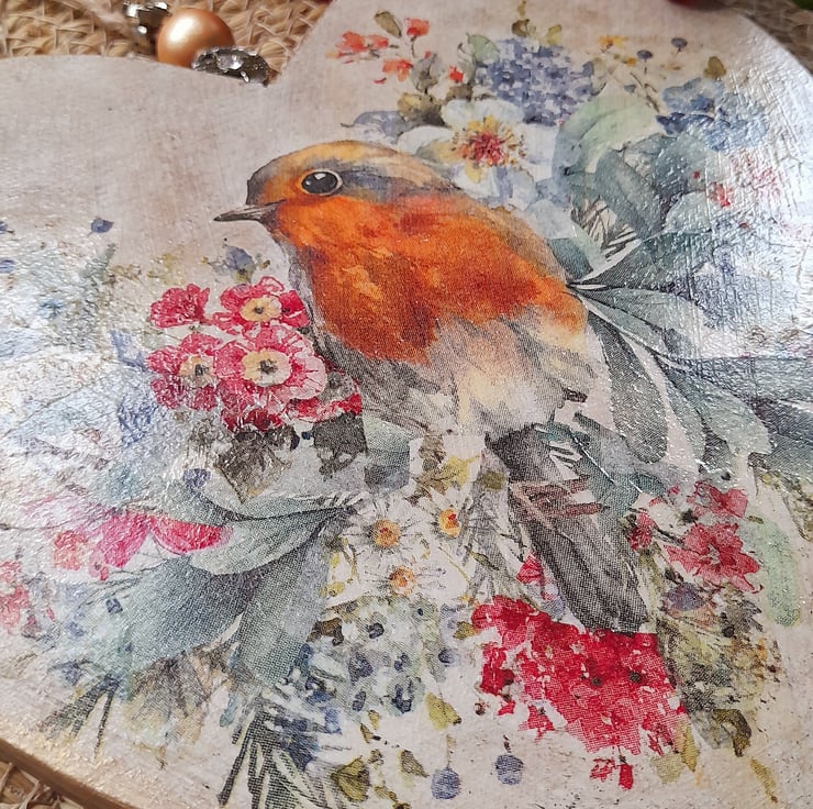 Painted & decoupaged to feature a Robin & Shabby Chic Florals to give a vintage finish.