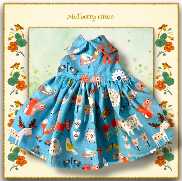A little turquoise dress in a woodland creatures print, to fit the Mulberry Green characters. The dress has a Peter Pan collar and a lined bodice. Perfect for the seaside.