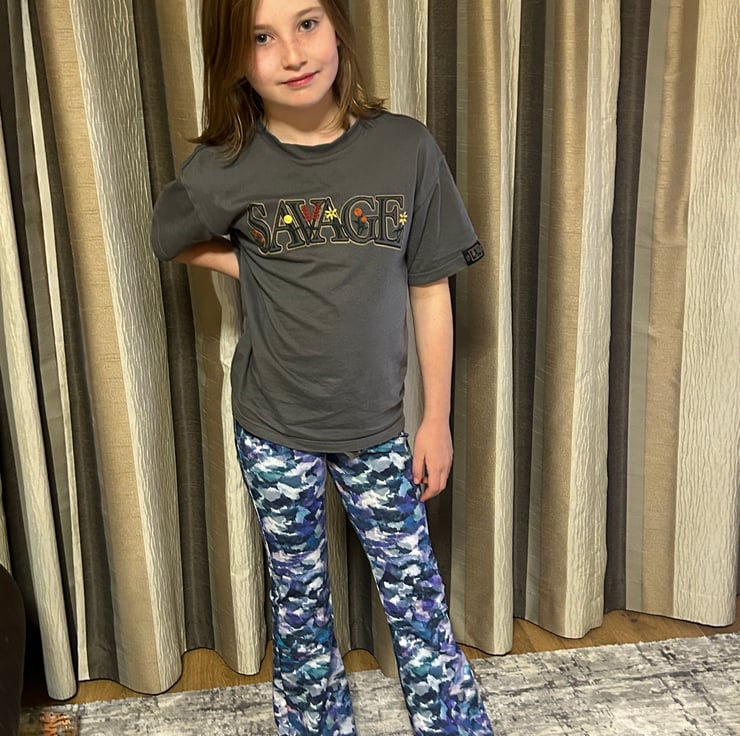 Ava is modelling our blue camouflage design kick flares in an size 10 years (she is 9.5)