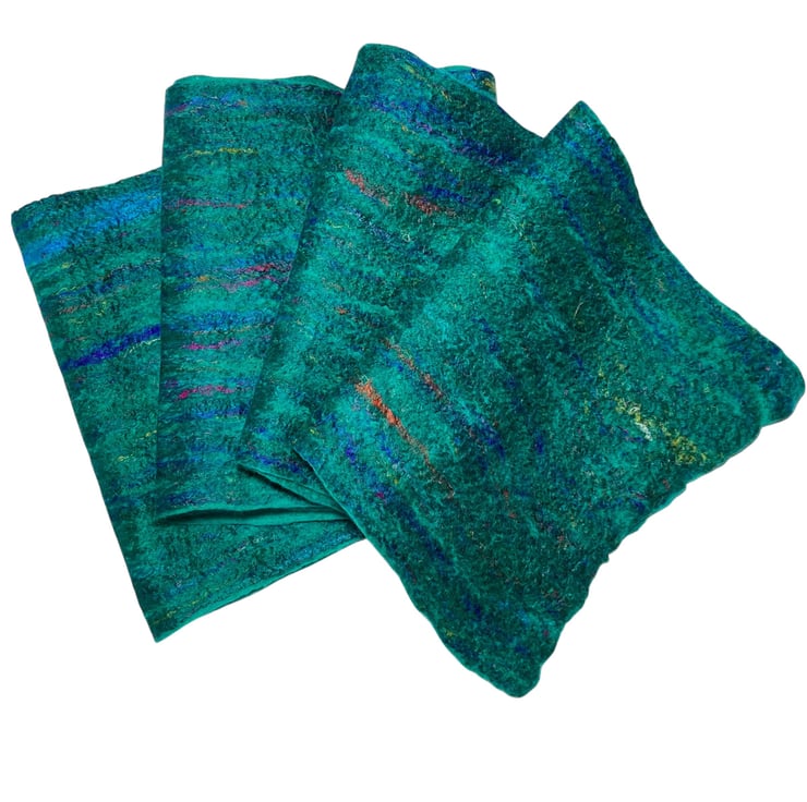 Made using beautifully soft merino wool fibres and topped with recycled sari silk fibres, this scarf is super lightweight yet still warm and cosy as well as looking striking. The scarf has been wet felted which binds the wool and silk fibres together to create a stable fabric. The silk fibre layer adds not only additional colour but also texture and a beautiful sheen to the surface.
