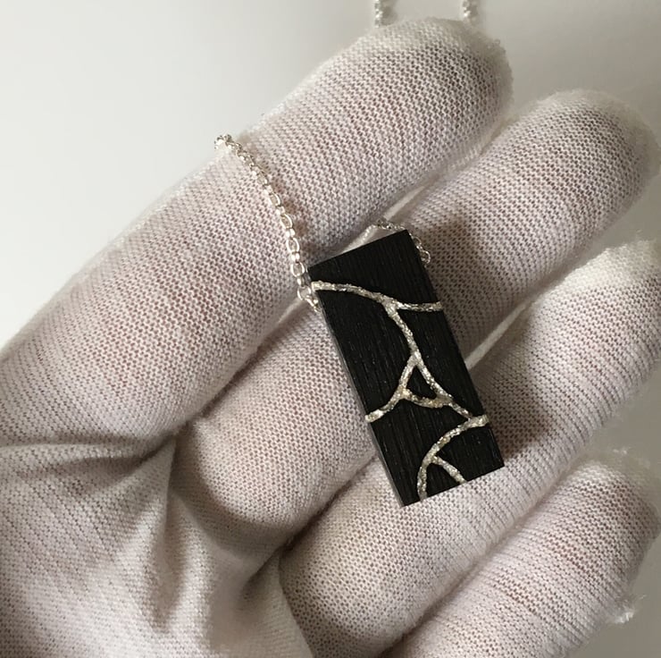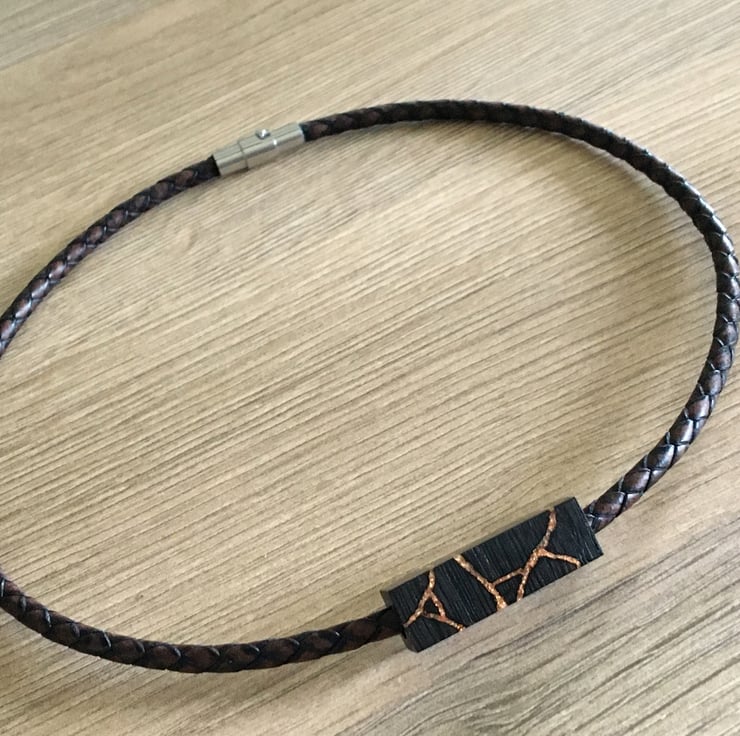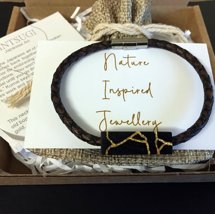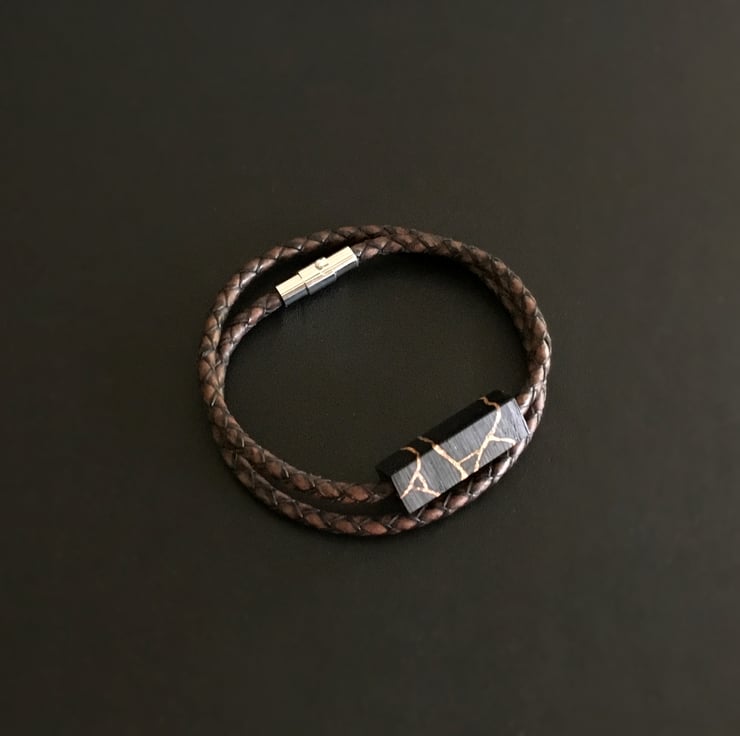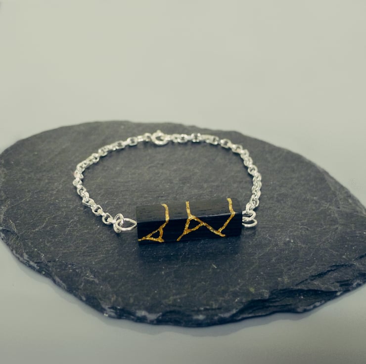 Kintsugi Sterling Silver Bracelet With 3200BC Bog Oak Wood & 24ct Gold Leaf Inlay.