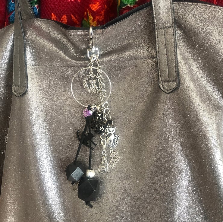 This Cats Handmade Bag Charm - a unique accessory that adds purr-sonality to your bag. Made with love, it features adorable metal and enamel cat charms, a soft black suede strap, and charming wooden beads.