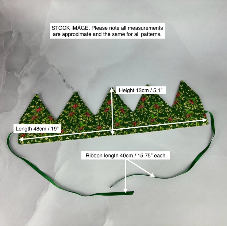 The crown has 5 points and 2 satin ribbons allowing for adjustment to get the perfect fit (minimum circumference approx. 48cm (19”).