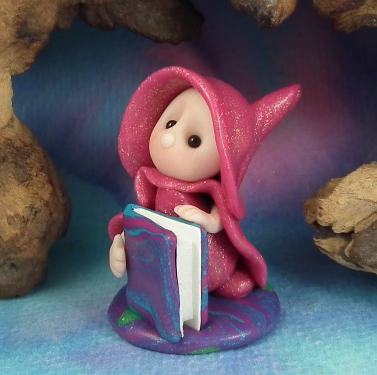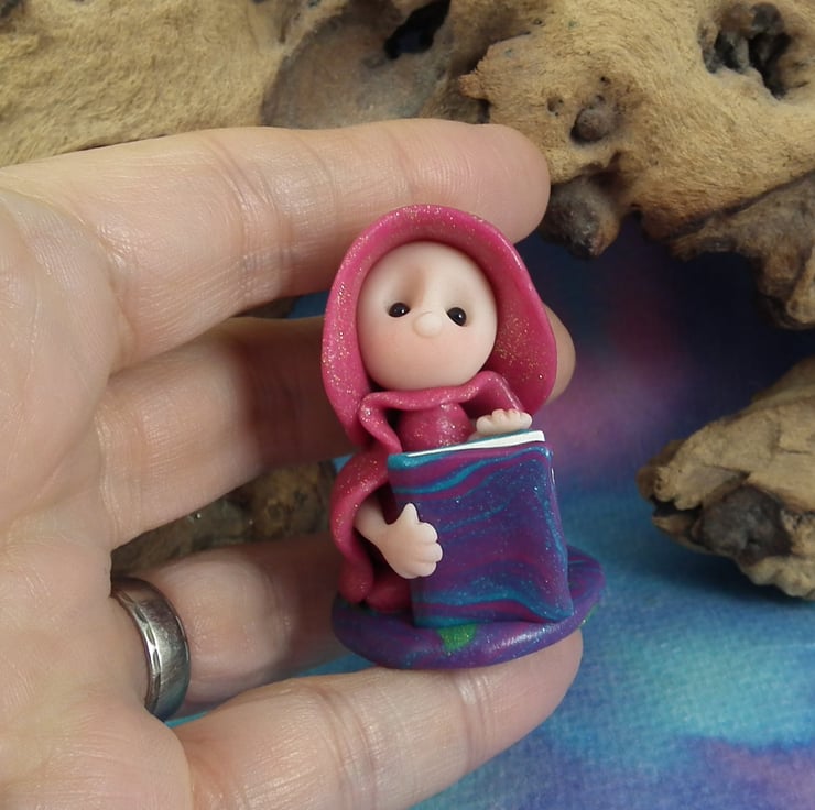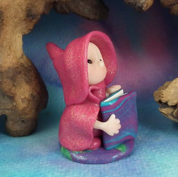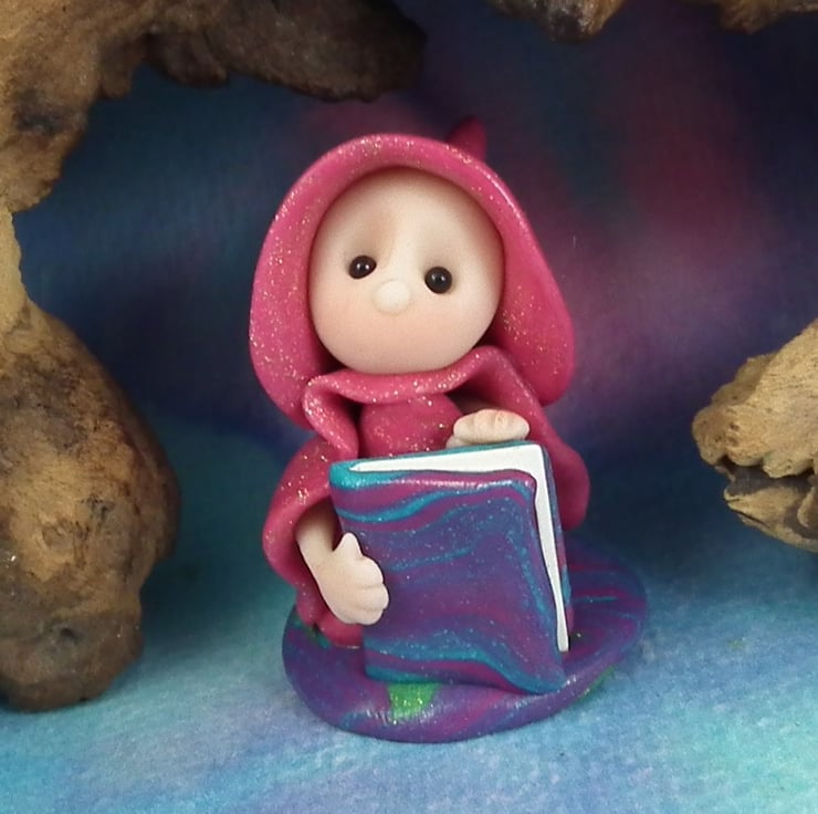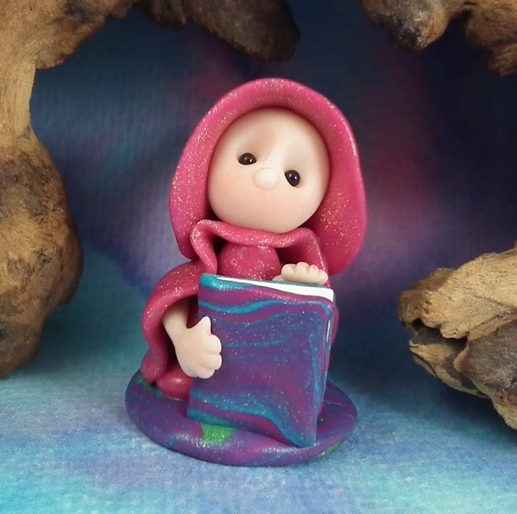 This is a 'one of a kind' creation having been entirely handmade without the use of moulds here at my studio on the Sussex Coast. Modelled with artist blend polymers, blushed before sealing with lacquer, Franki has sparkling black onyx eyes and a large storybook. Franki the Library Gnome is just one and a half inches tall.