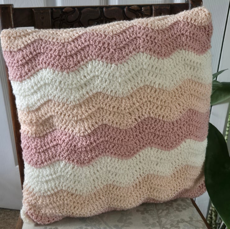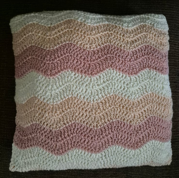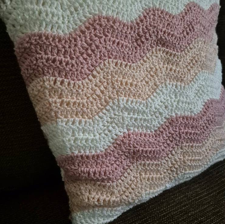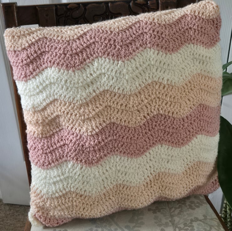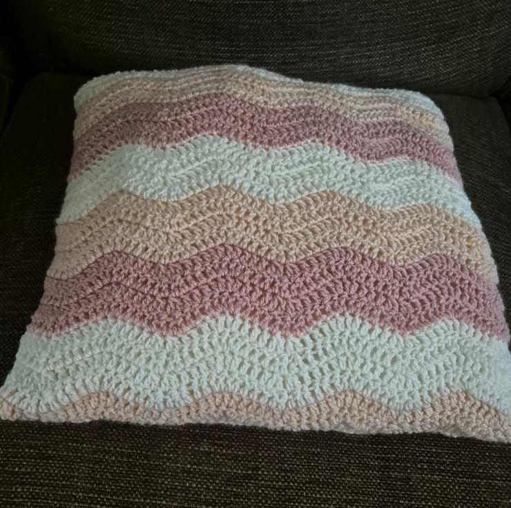Handmade crochet cushion cover in a lovely rippled pattern of contrasting neutral colours. This cushion will bring warmth to your home and the soft pastel colours will blend in with your natural enviroment