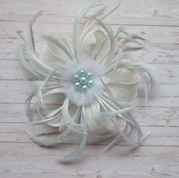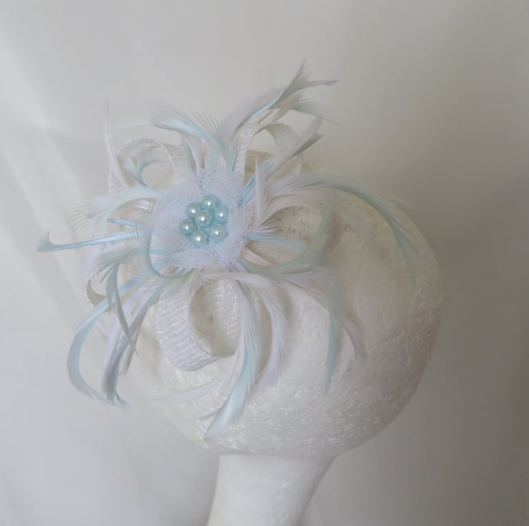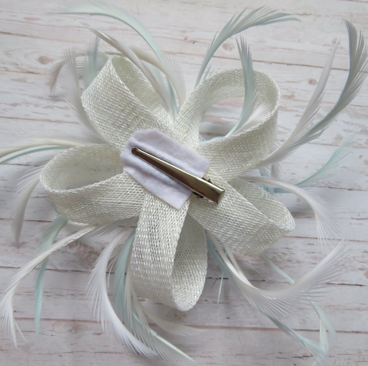 This ready-to-ship piece is handcrafted with a delicate bow of winter white sinamay bias binding, adorned with gently curled biot feathers in white and pale blue.