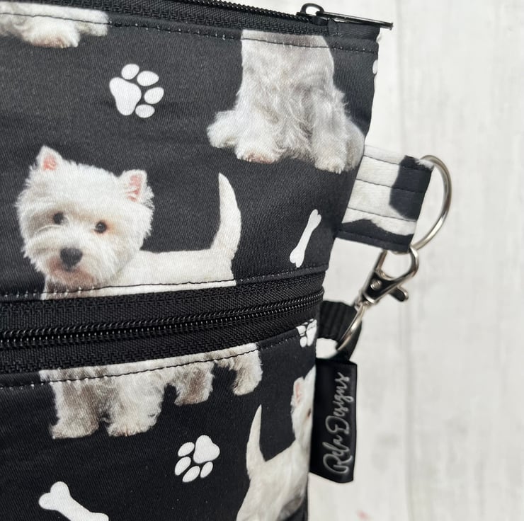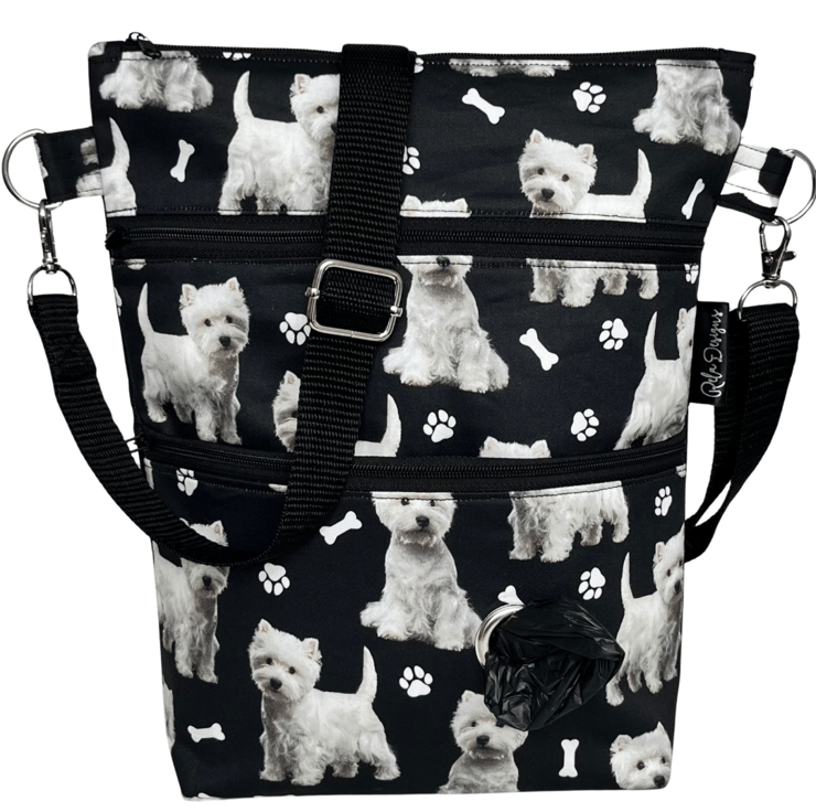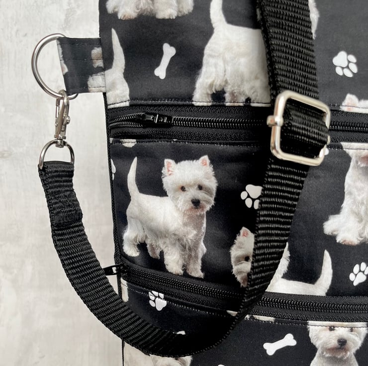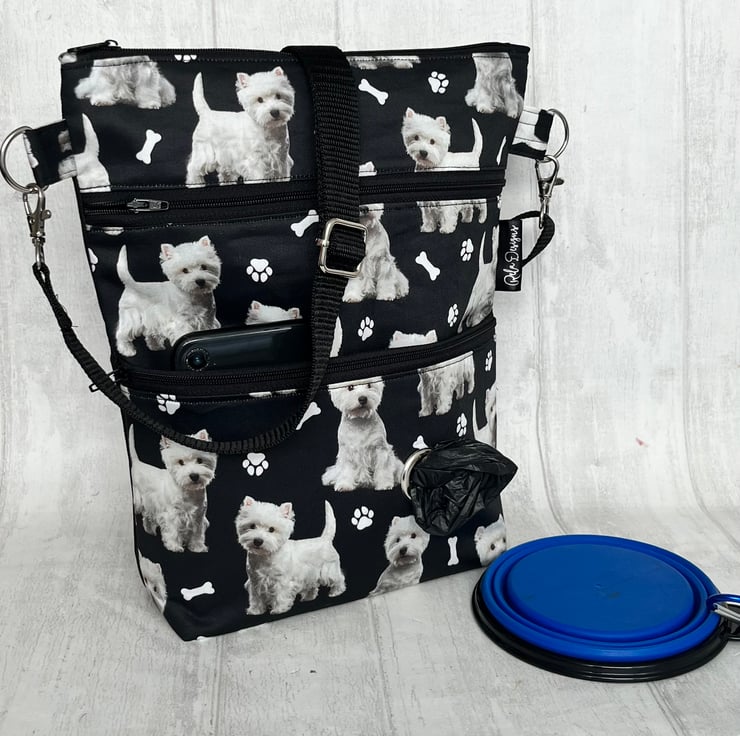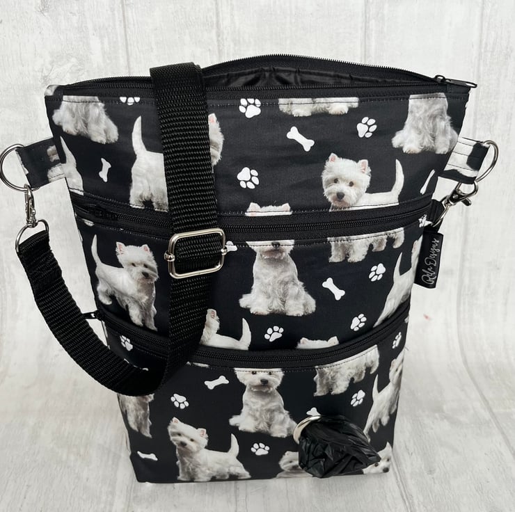 This cute westie cotton print dog walking bag is backed with a black waterproof canvas and lined with a black nylon waterproof fabric.