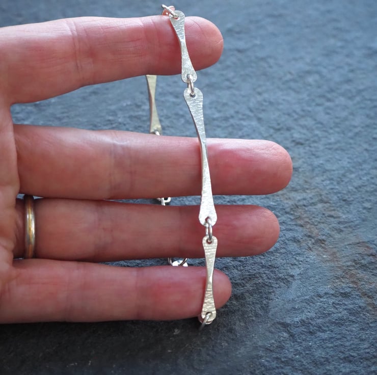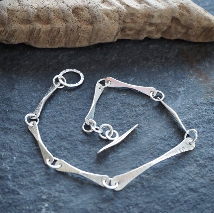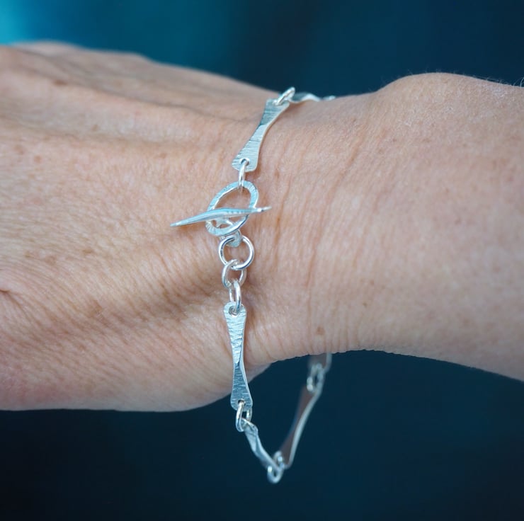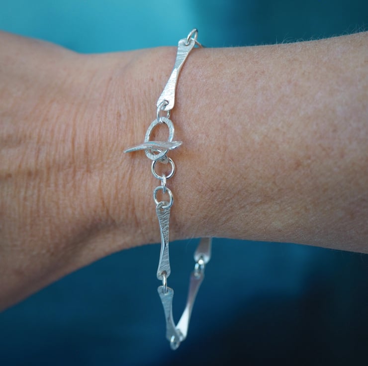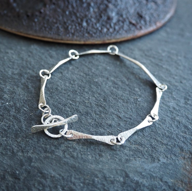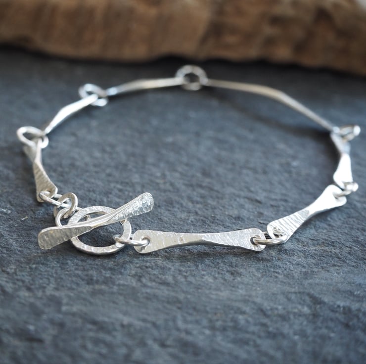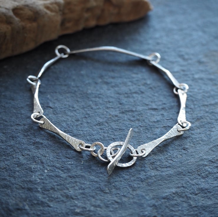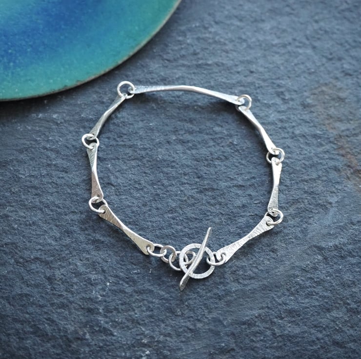 This silver bracelet has been finished with a lovely shimmery texture created with one of my vintage hammers. The silver is then burnished and polished to a bright shine. This bracelet is completely made by me, by hand, no machine made components.