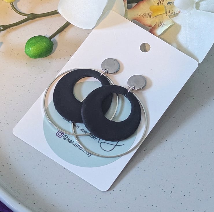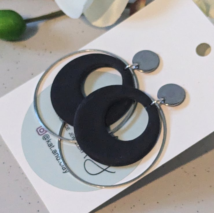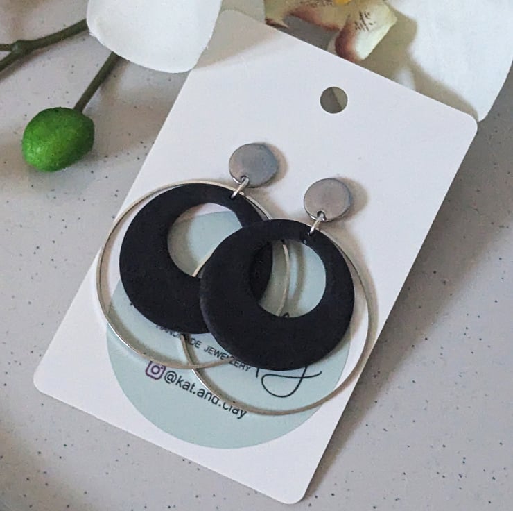 Black circular earrings with a silver ring attachment and silver stud. Made from FIMO polymer clay and hypoallergenic stainless steel studs and fixings.