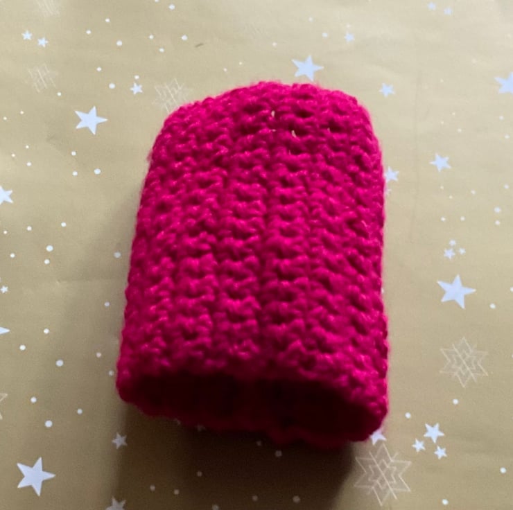 Crochet Cup Cosy hand made using a cerise pink yarn.