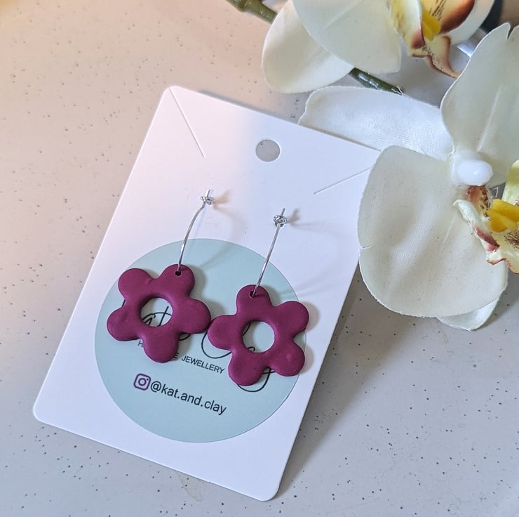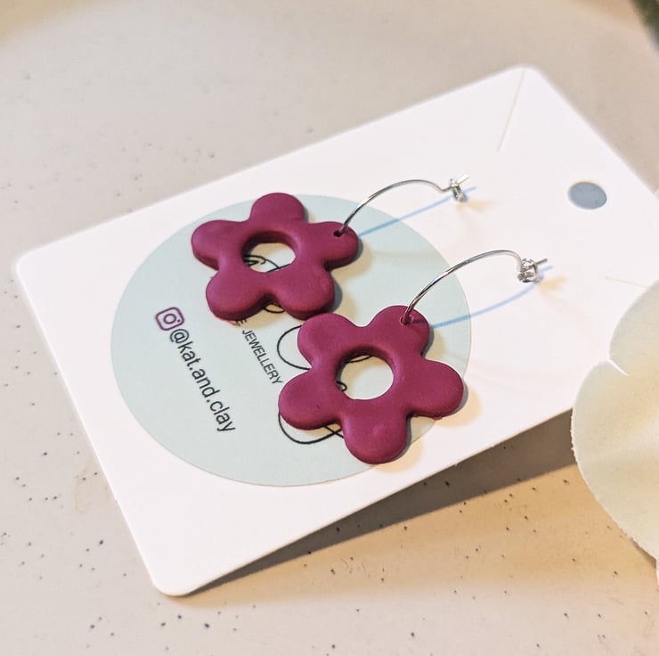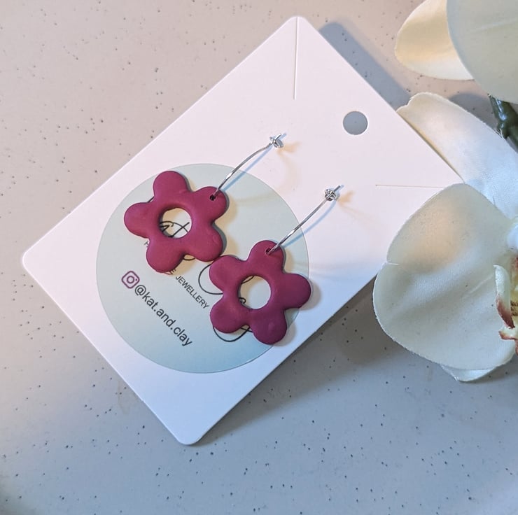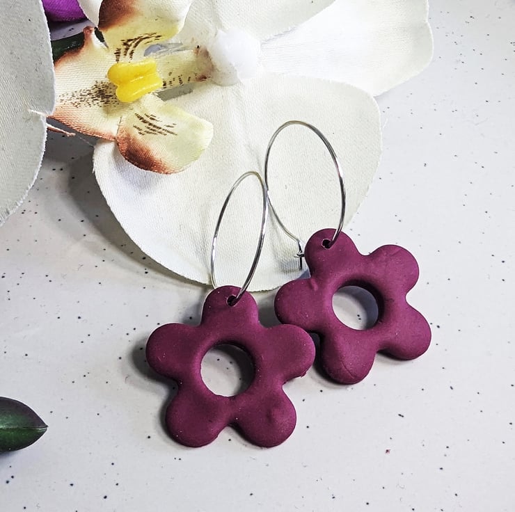 Simple dark pink floral earrings, hanging from a silver hoop. Made from FIMO polymer clay. Other colours available - check my shop for availability.