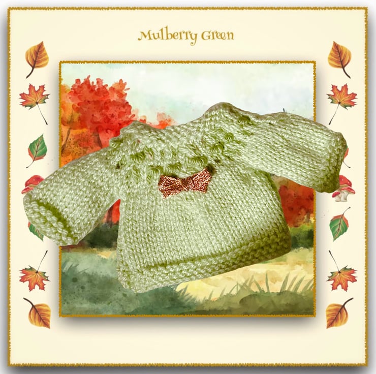 A pretty little pale green cardigan with a patterned yoke, to fit the Mulberry Green characters. The cardigan is hand knitted, decorated with a little fox on the front and a bow on the back and is finished with three little buttons.