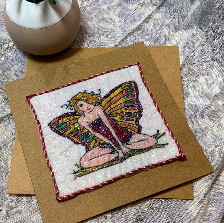 Hand painted and embroidered on a shimmer sparkle background with a festive satin twine frame. Mounted on a golden brown card for rustic charm.