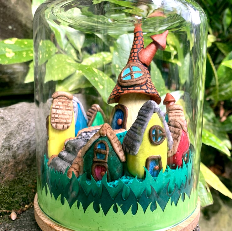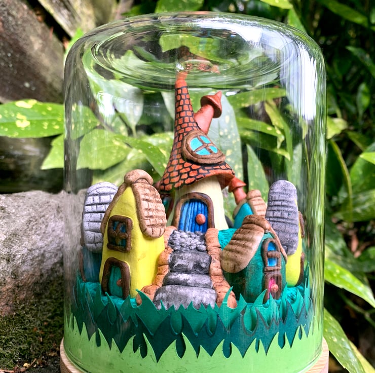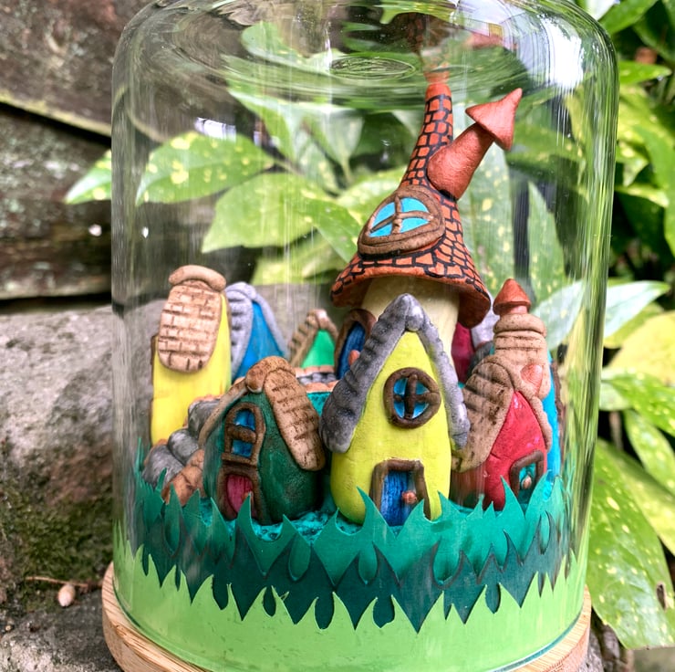A Fairy house village scene hand crafted from Polymer clay and painted with acrylic paints. the scene is displayed in a glass jar.
