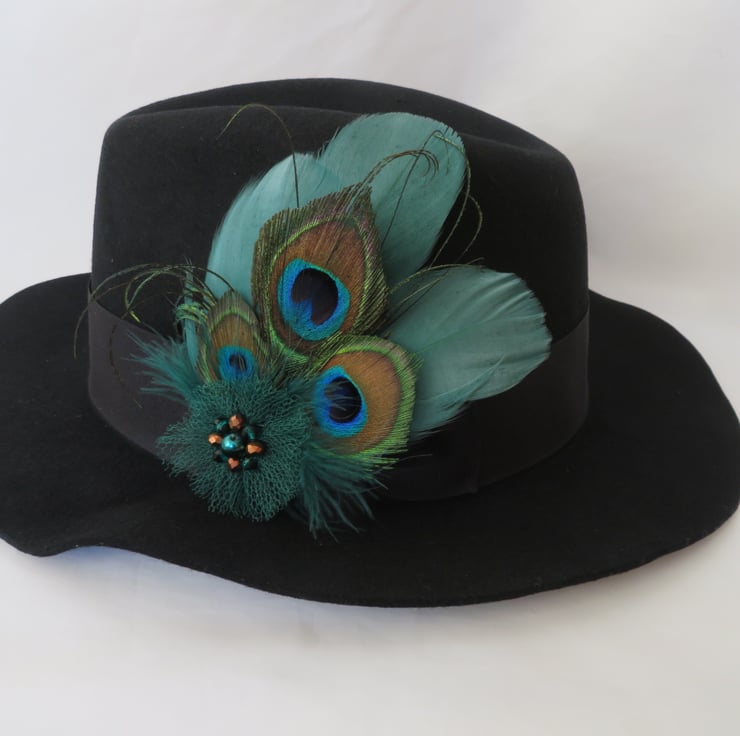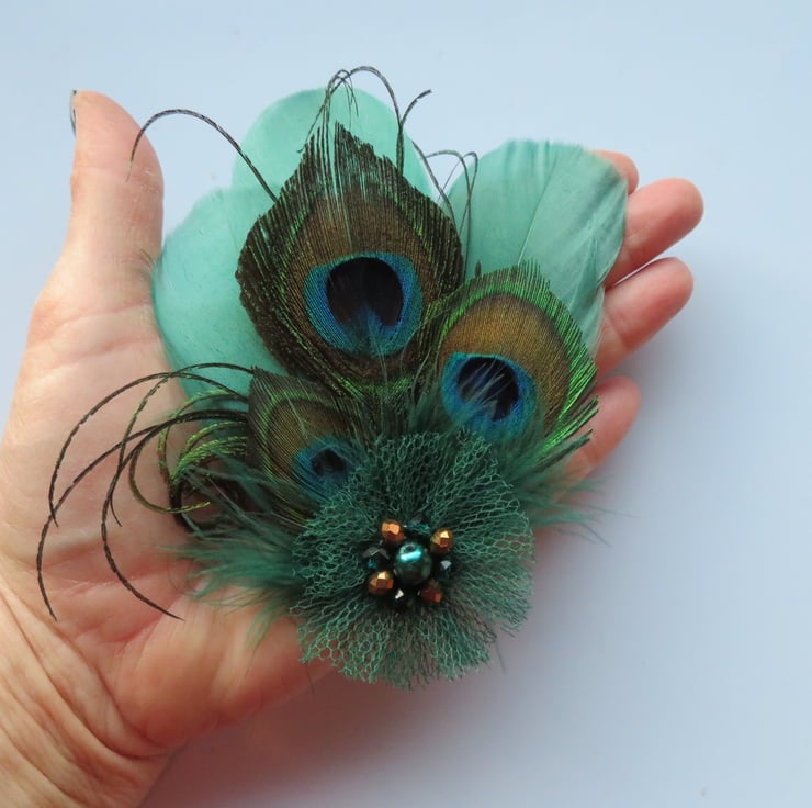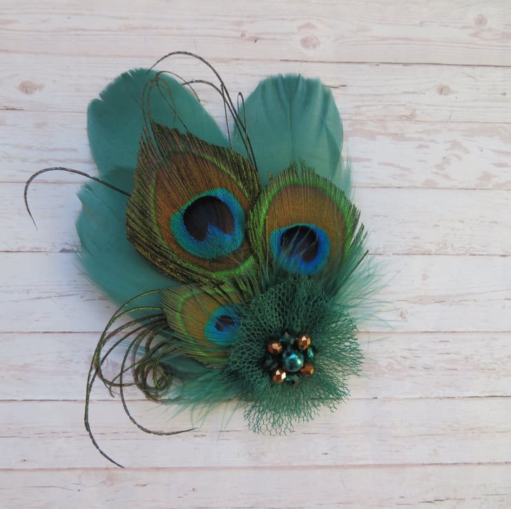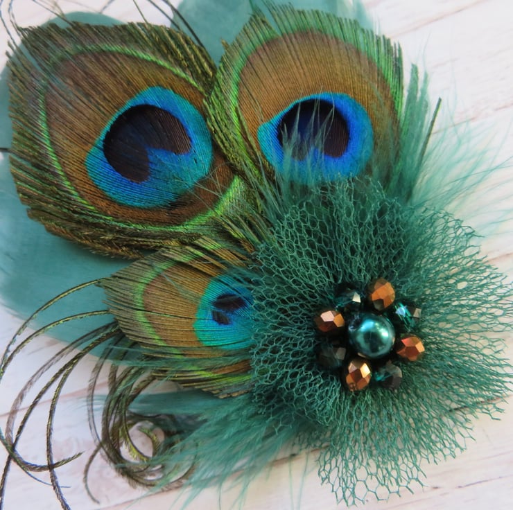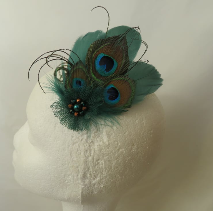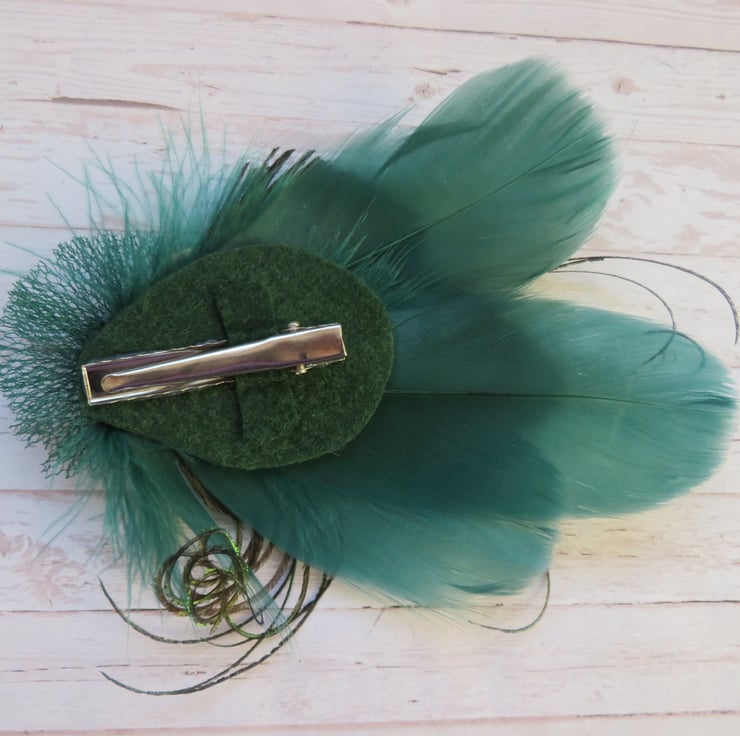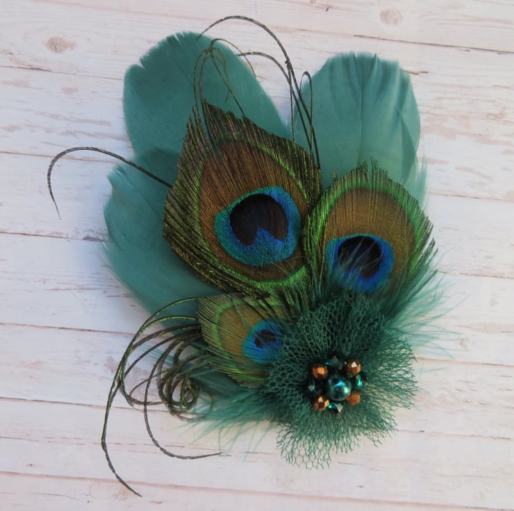Made with three shaped bottle green goose feathers, three small trimmed peacock eye feathers, bottle green fluff feather, curled peacock fronds and finished with bottle green tulle ruffle with a cluster of bottle green and metallic copper crystals and a dark green pearl in the centre.