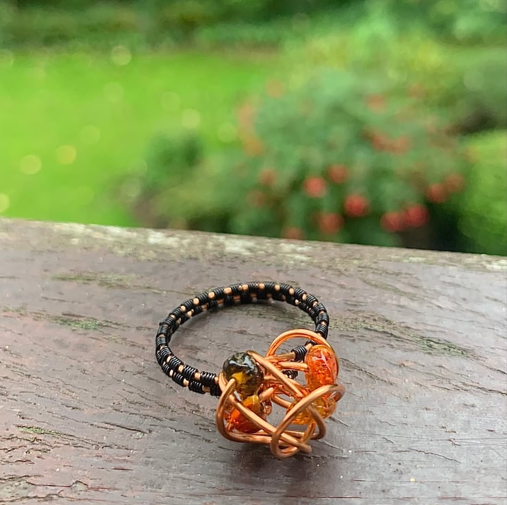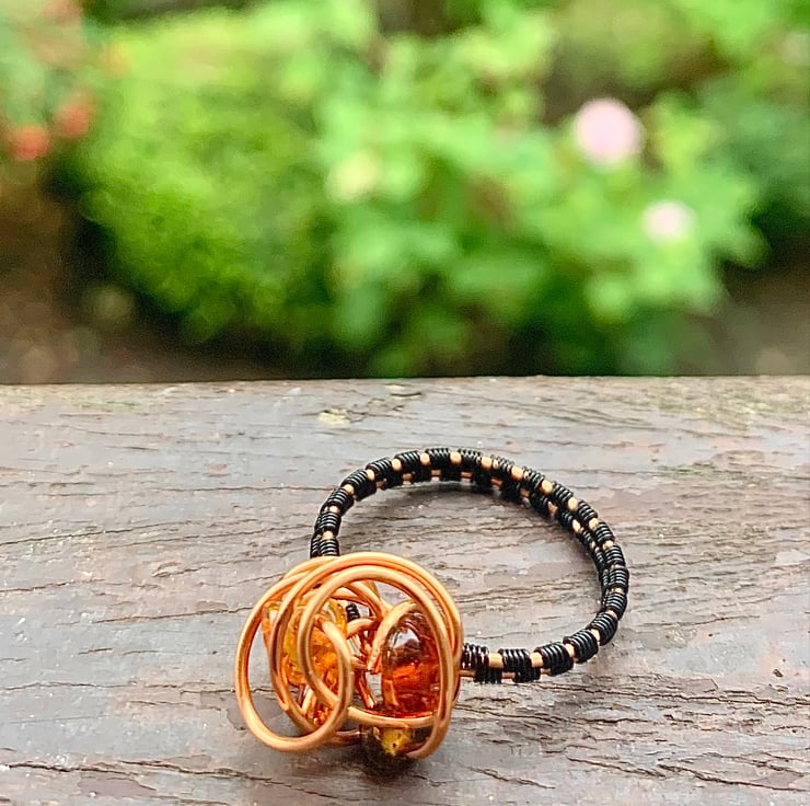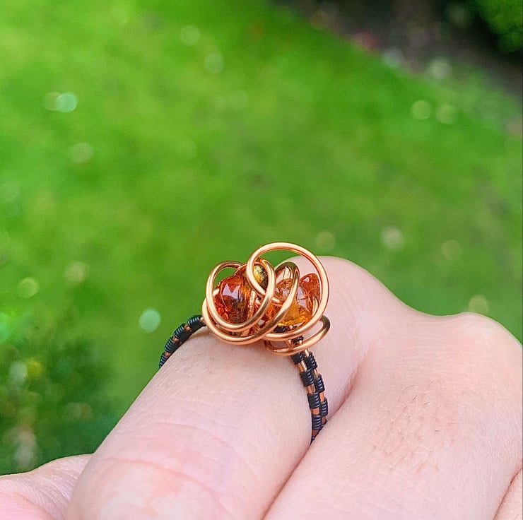 This ring was handcrafted using high quality Lithuanian amber. Skilfully wrapped in rose gold coated copper wire with a black weave band.