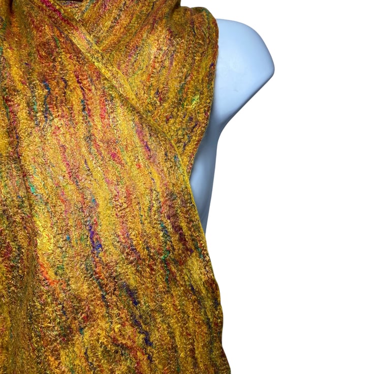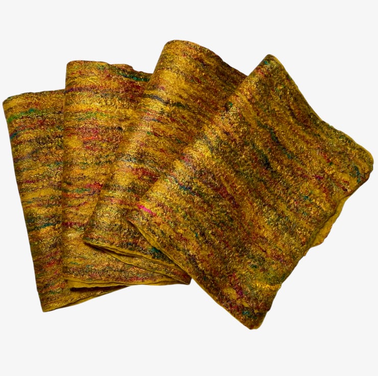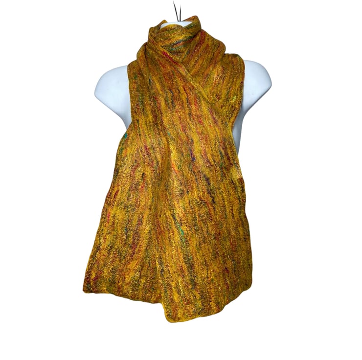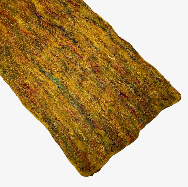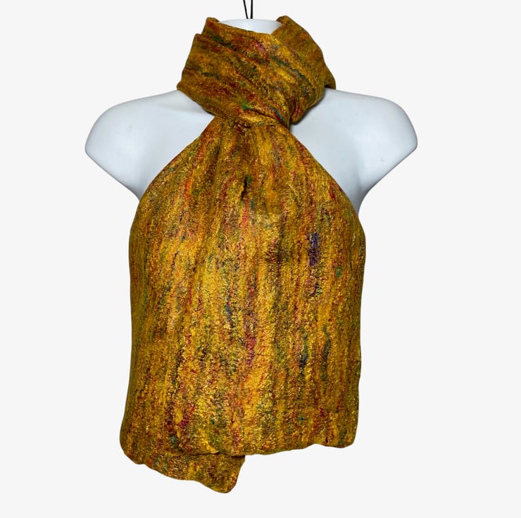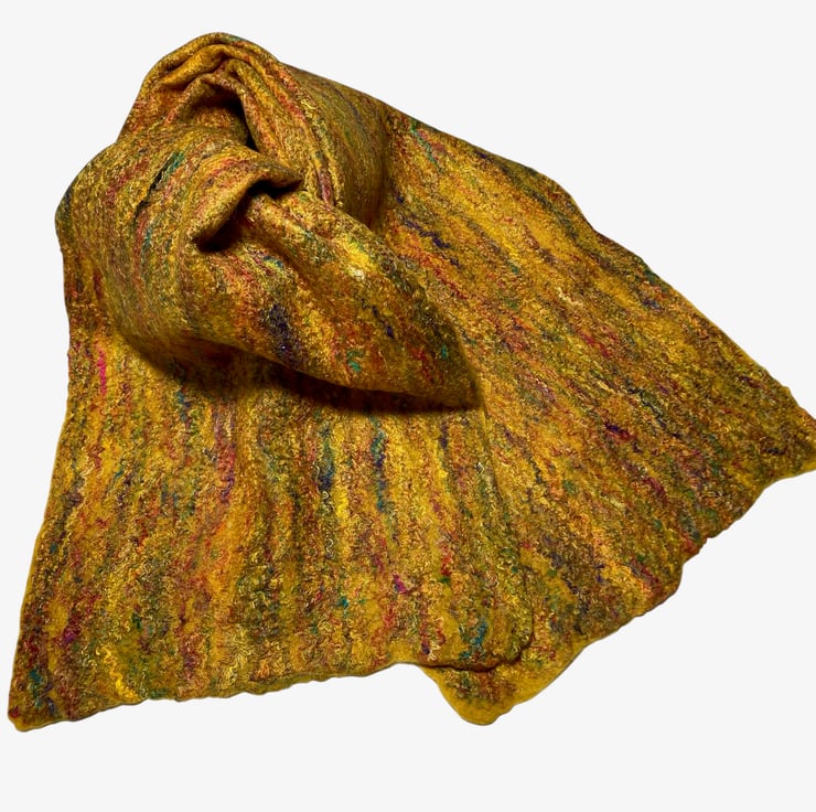 This scarf is made using beautifully soft merino wool fibres, topped with recycled sari silk fibres. The fibres have been laid out and then wet felted which binds the wool and silk fibres together to create a stable fabric. The silk fibre layer adds not only additional colour but also texture and a beautiful sheen to the surface.