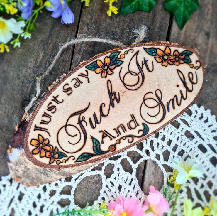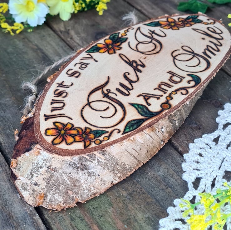 Pyrography is used to hand burn one of my designs onto a smooth sanded live edge log slice, the addition of a touch of colour and some hanging twine, all together makes for a unique piece that is finished with a layer of matt varnish to give a natural look whilst providing protection.