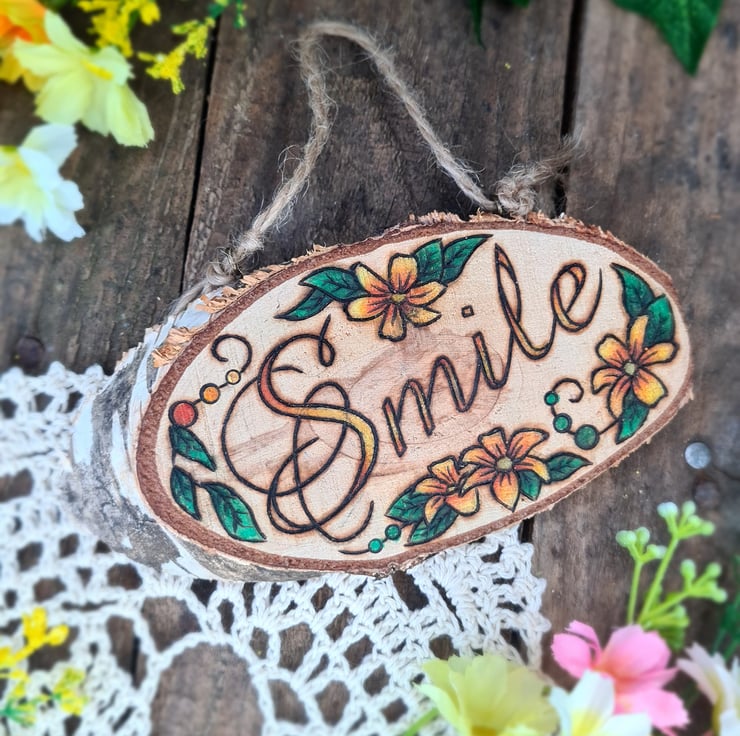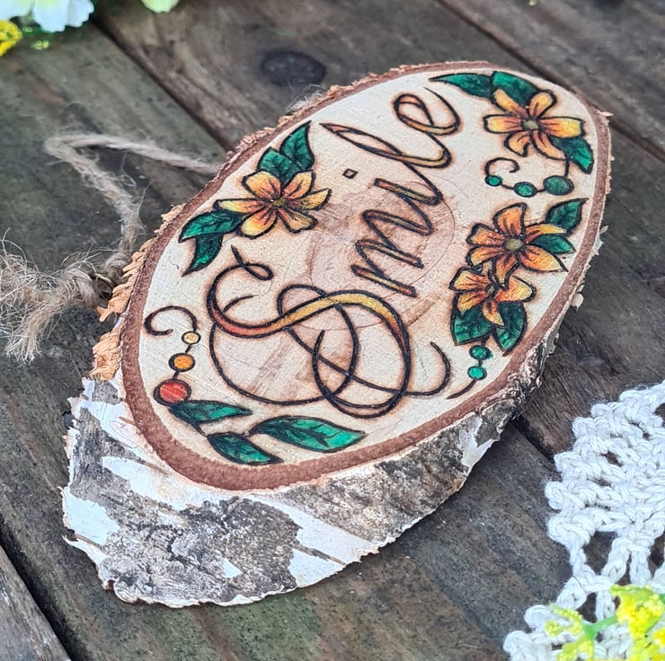 Pyrography is used to hand burn one of my designs onto a smooth sanded live edge log slice, the addition of a touch of colour and some hanging twine, all together makes for a unique piece that is finished with a layer of matt varnish to give a natural look whilst providing protection.