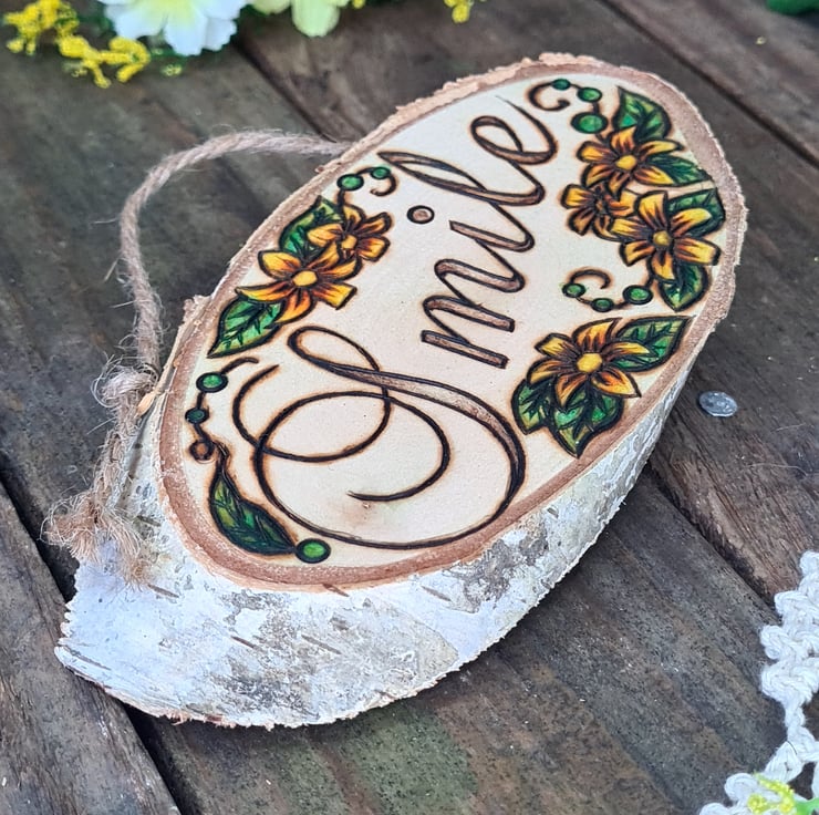 Pyrography is used to hand burn one of my designs onto a smooth sanded live edge log slice, the addition of a touch of colour and some hanging twine, all together makes for a unique piece that is finished with a layer of matt varnish to give a natural look whilst providing protection.