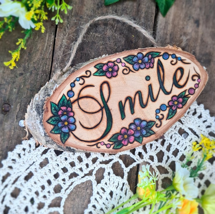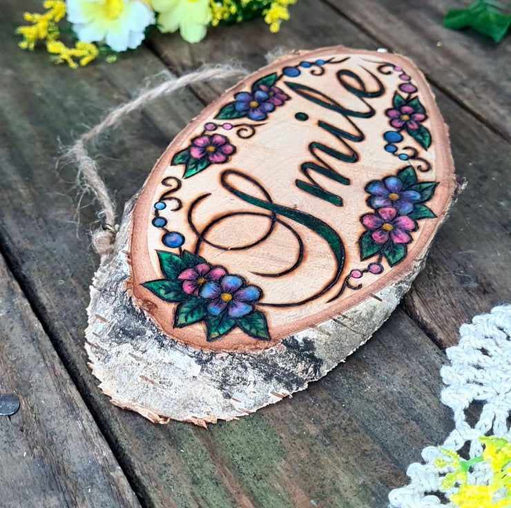 Pyrography is used to hand burn one of my designs onto a smooth sanded live edge log slice, the addition of a touch of colour and some hanging twine, all together makes for a unique piece that is finished with a layer of matt varnish to give a natural look whilst providing protection.