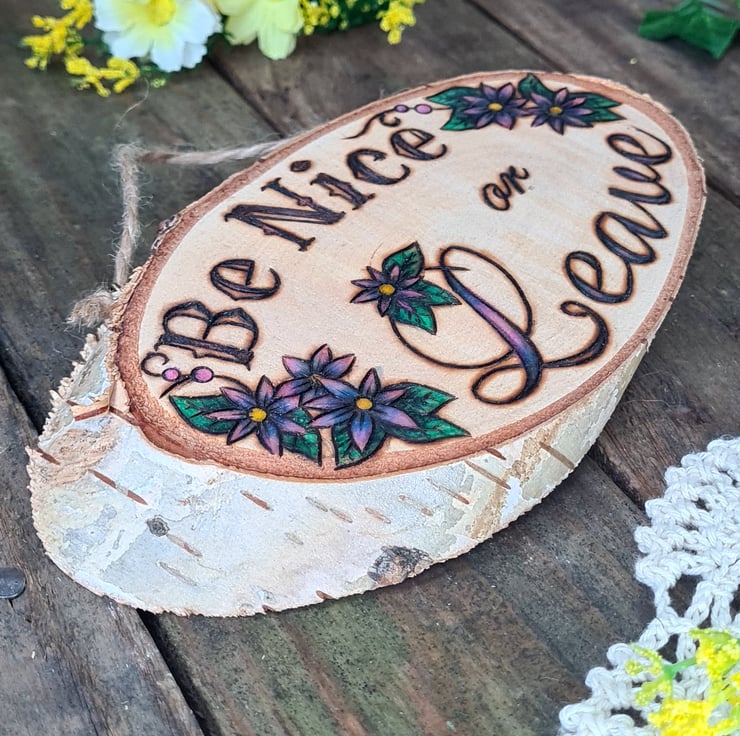 Pyrography is used to hand burn one of my designs onto a smooth sanded live edge log slice, the addition of a touch of colour and some hanging twine, all together makes for a unique piece that is finished with a layer of matt varnish to give a natural look whilst providing protection.