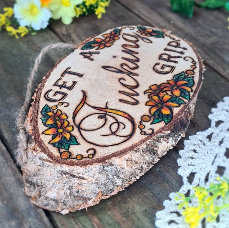 Pyrography is used to hand burn one of my designs onto a smooth sanded live edge log slice, the addition of a touch of colour and some hanging twine, all together makes for a unique piece that is finished with a layer of matt varnish to give a natural look whilst providing protection.